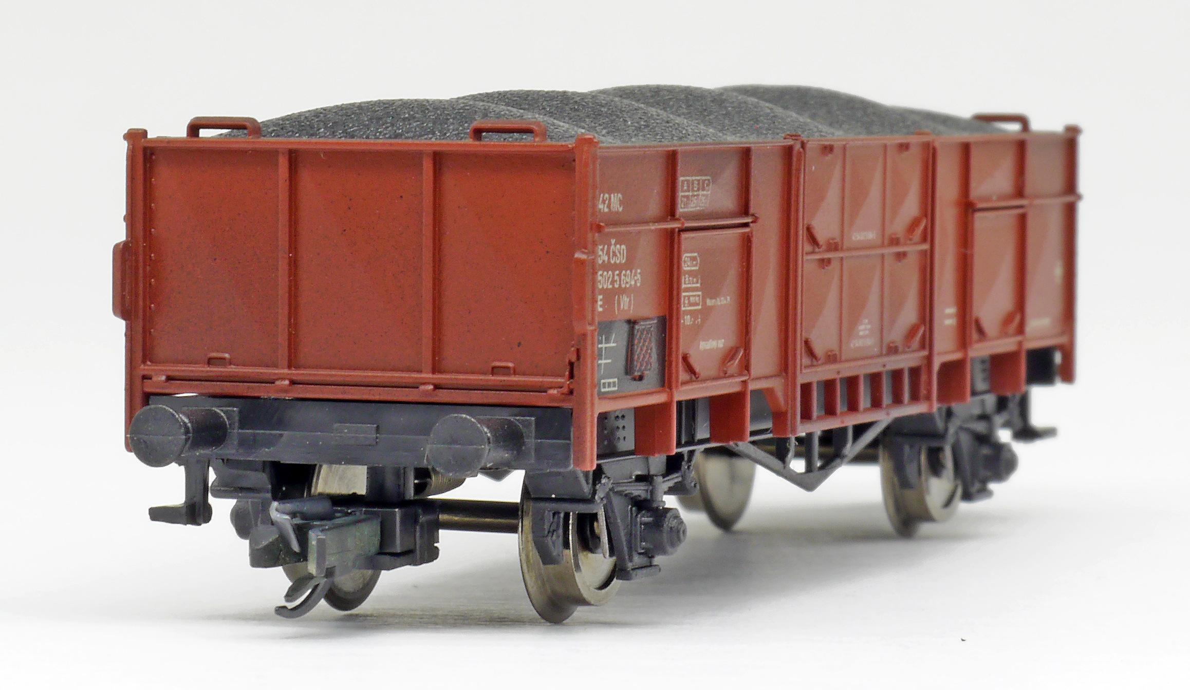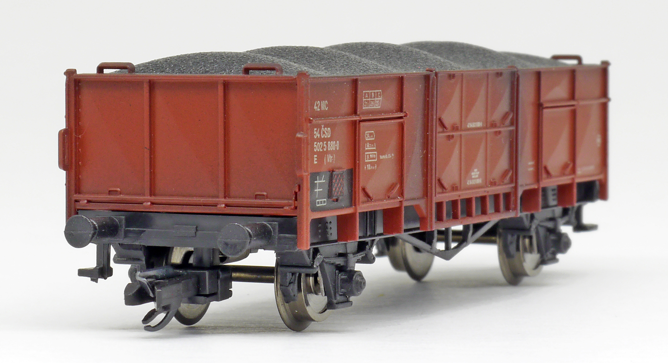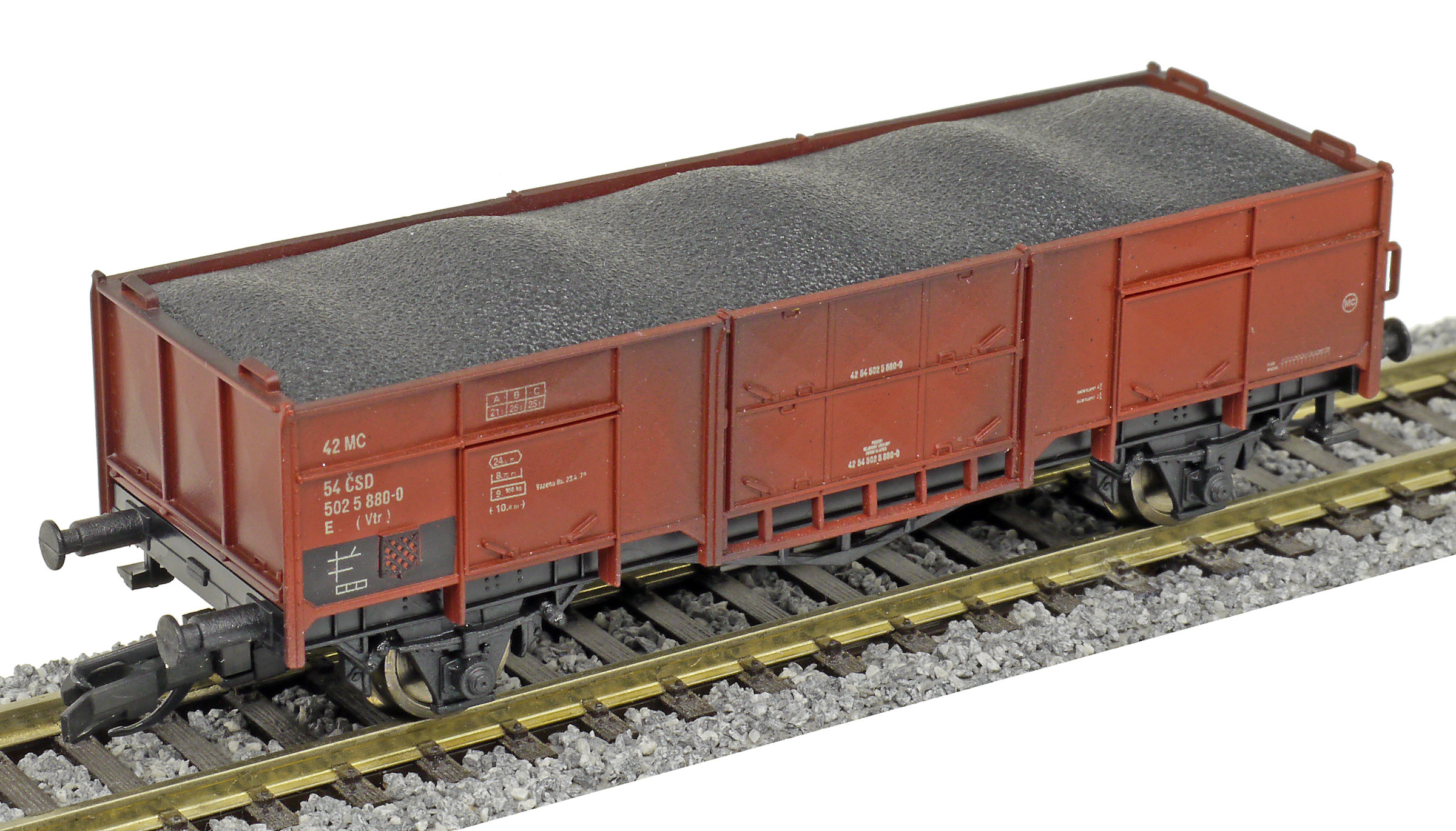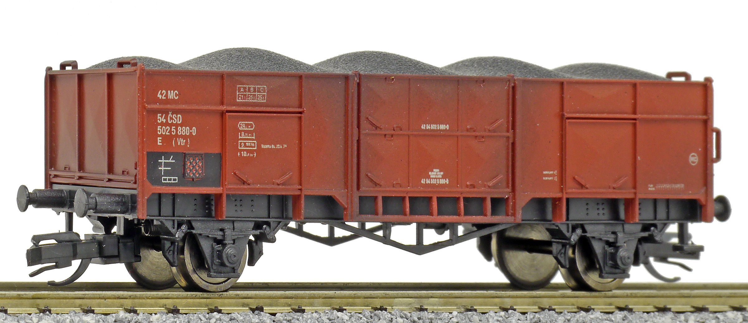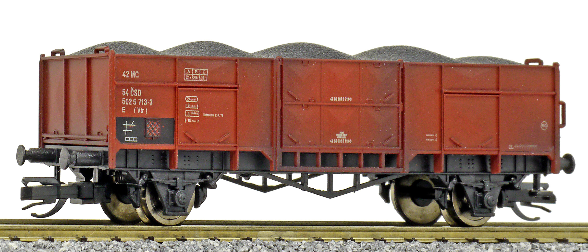 | otevřený nákladní vůz červenohnědý s nákladem, přetisky čísla vozu |