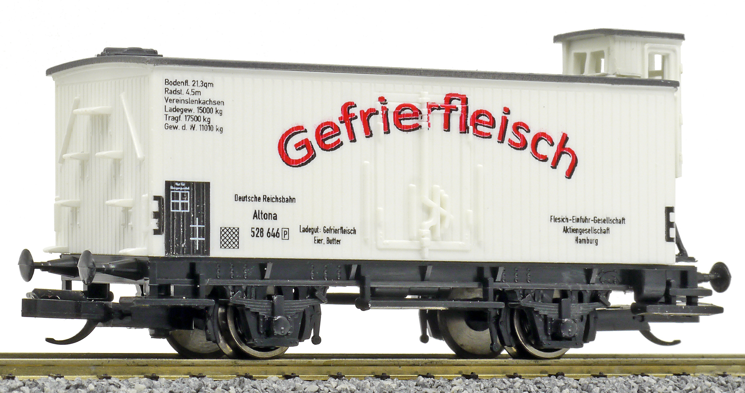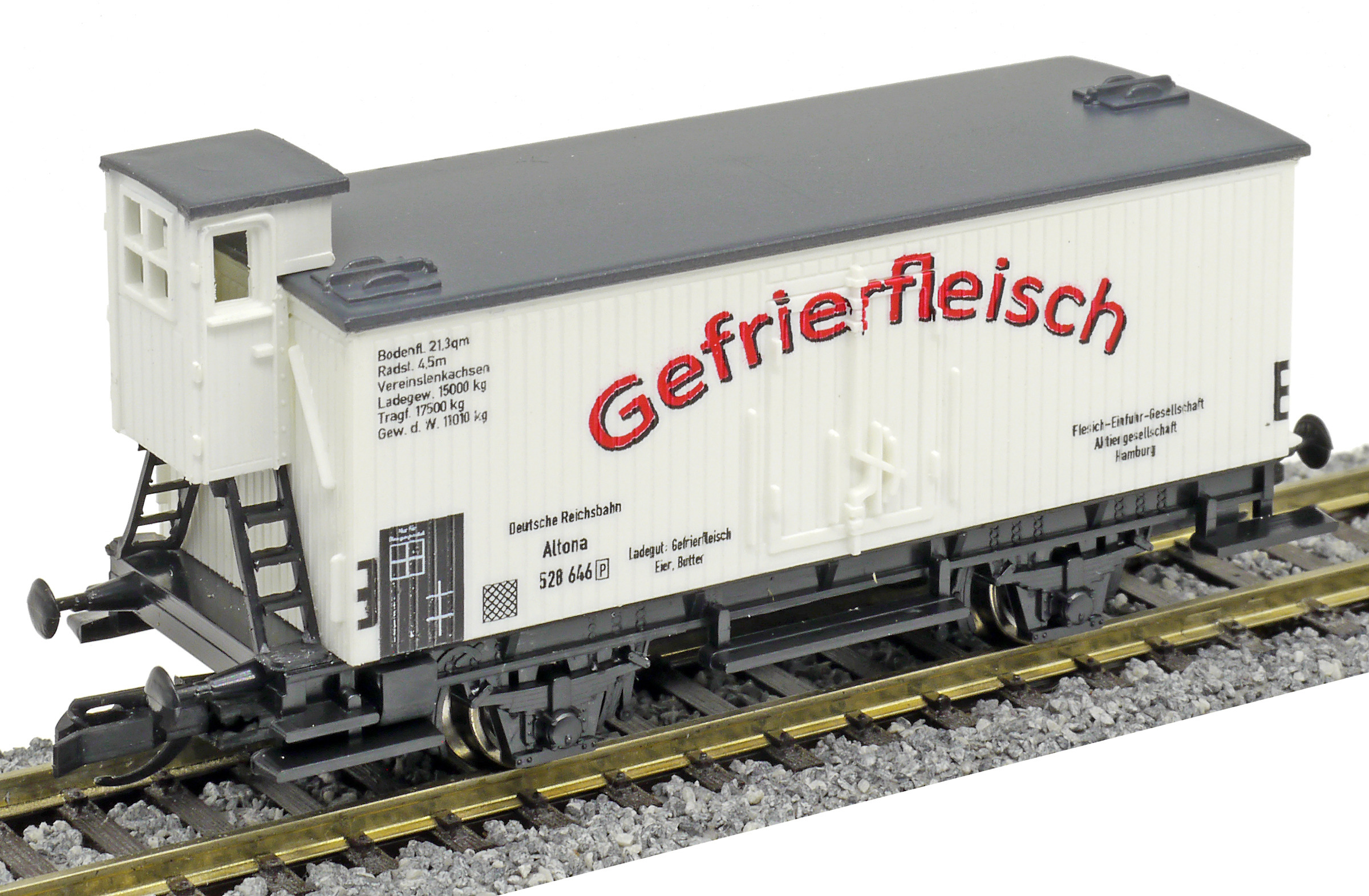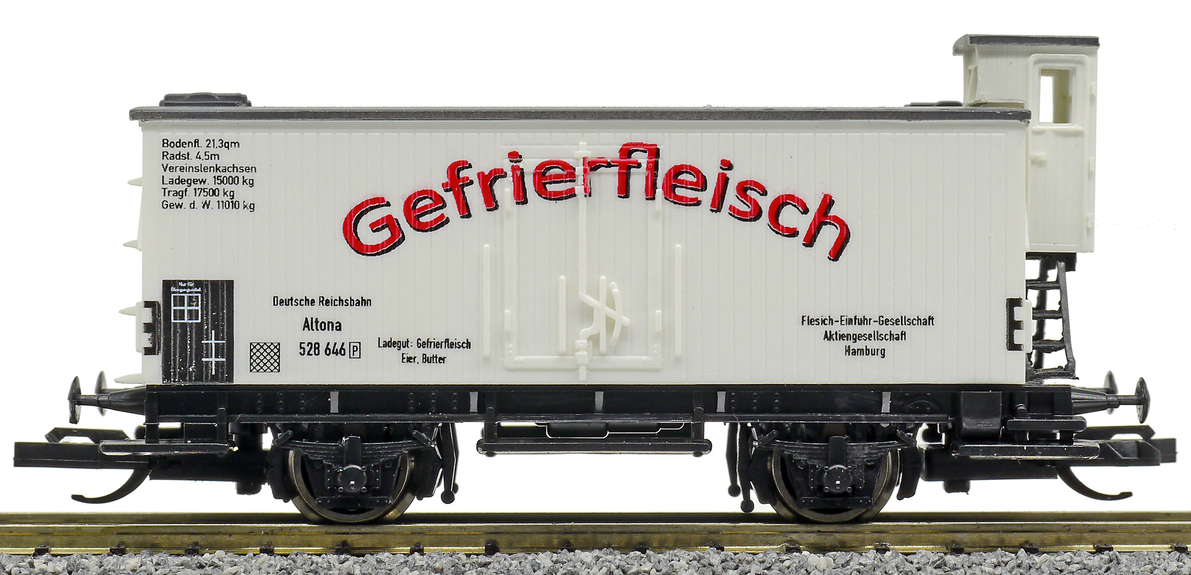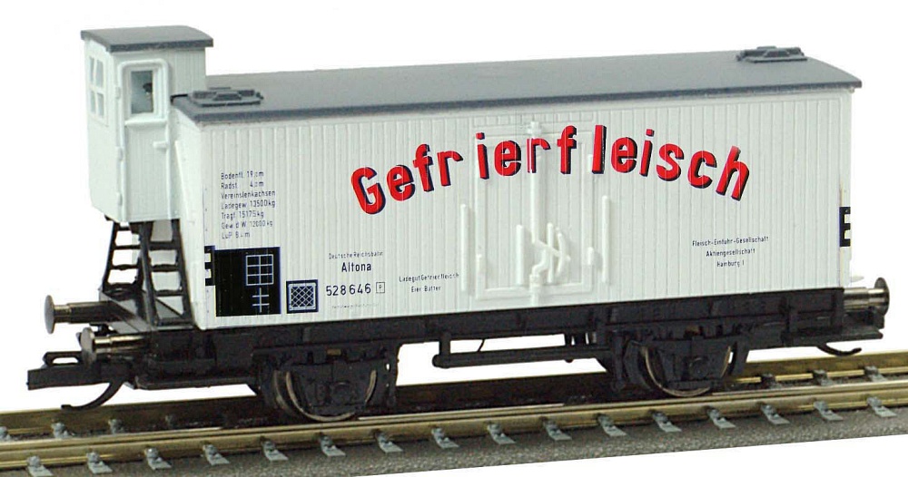 | nákladní chladící vůz bílý s šedou střechou a brzdařskou budkou „Gefrierfleisch“ |