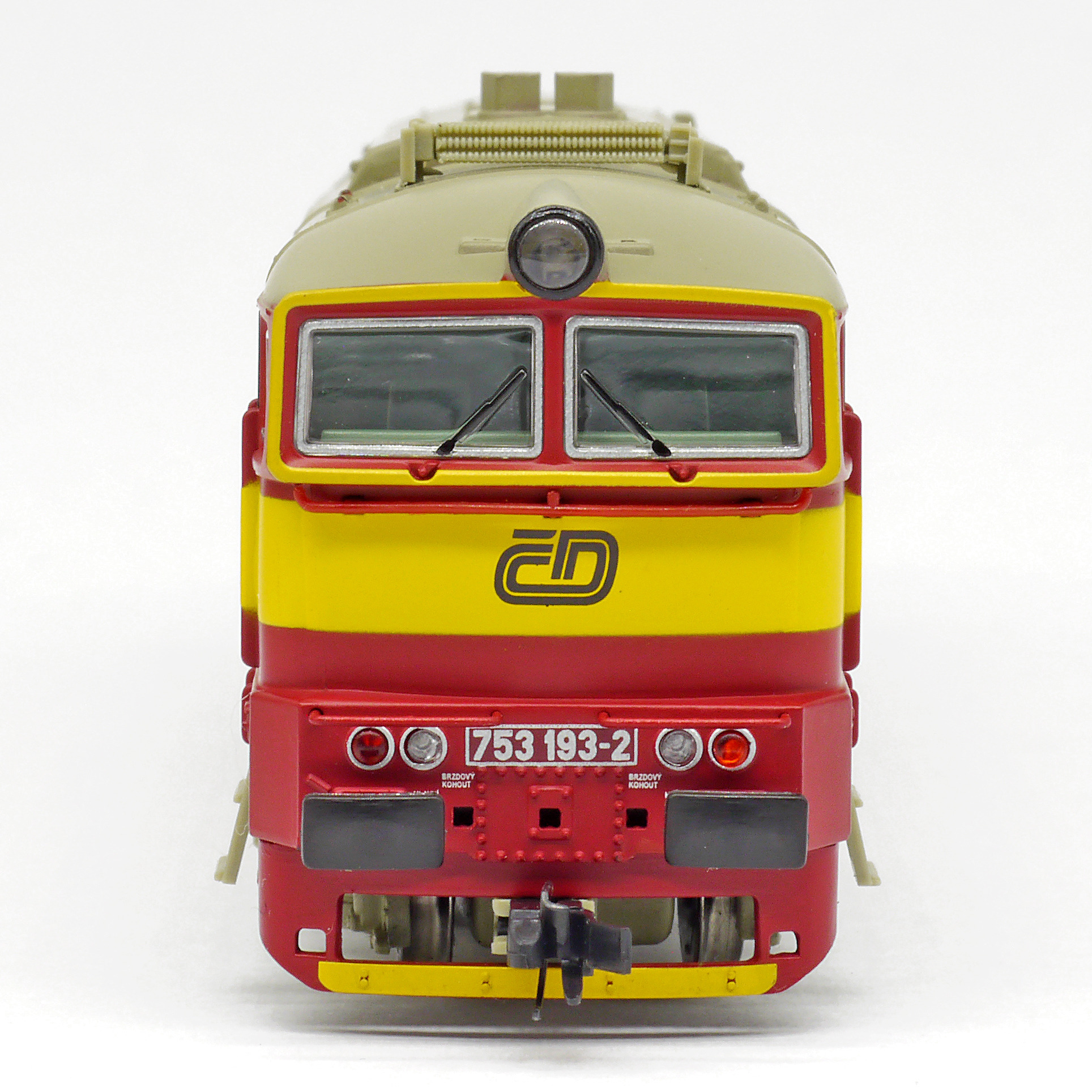 | dieselová lokomotiva červená s výstražným žlutým pruhem, šedá střecha |
