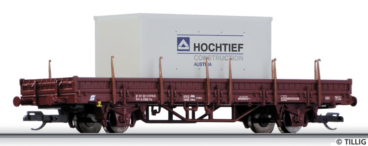 | nízkostěnný nákladní vůz červenohnědý s nákladem kontejneru „HOCHTIEF“ |