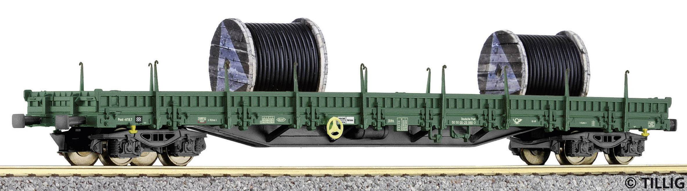 | nízkostěnný nákladní vůz zelený s nákladem dvou kabelových bubnů |