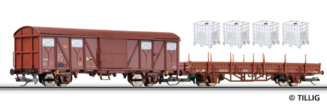 | nízkostěnný nákladní vůz červenohnědý s nákladem 4 IBCkontejnerů „Gefahrgut” |