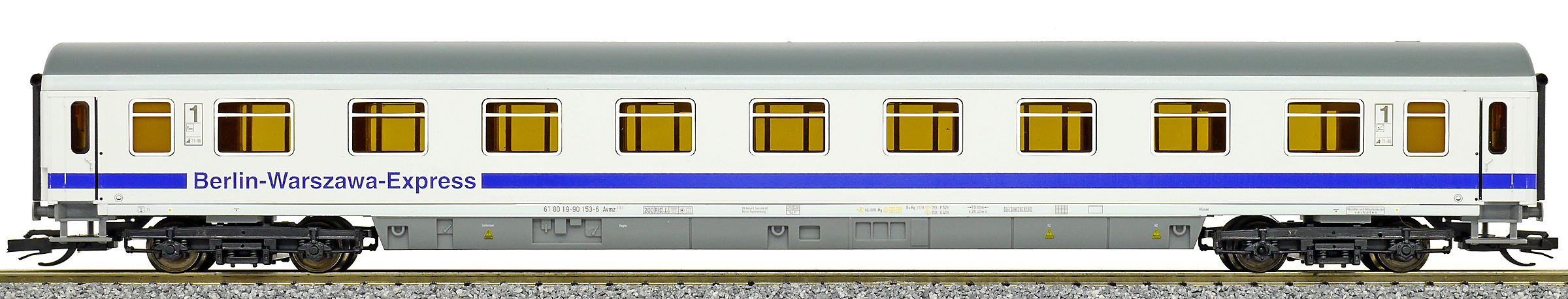 | rychlíkový vůz bílý s šedou střechou 1. tř. „Berlin-Warzawa-Express“ |