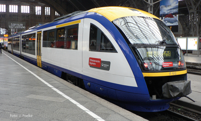 | bílá-modrá-žlutá motorová jednotka "Mitteldeutschen Regiobahn" |