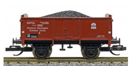 | otevřený nákladní vůz červenohnědý s brzdařskou budkou ložený uhlím |