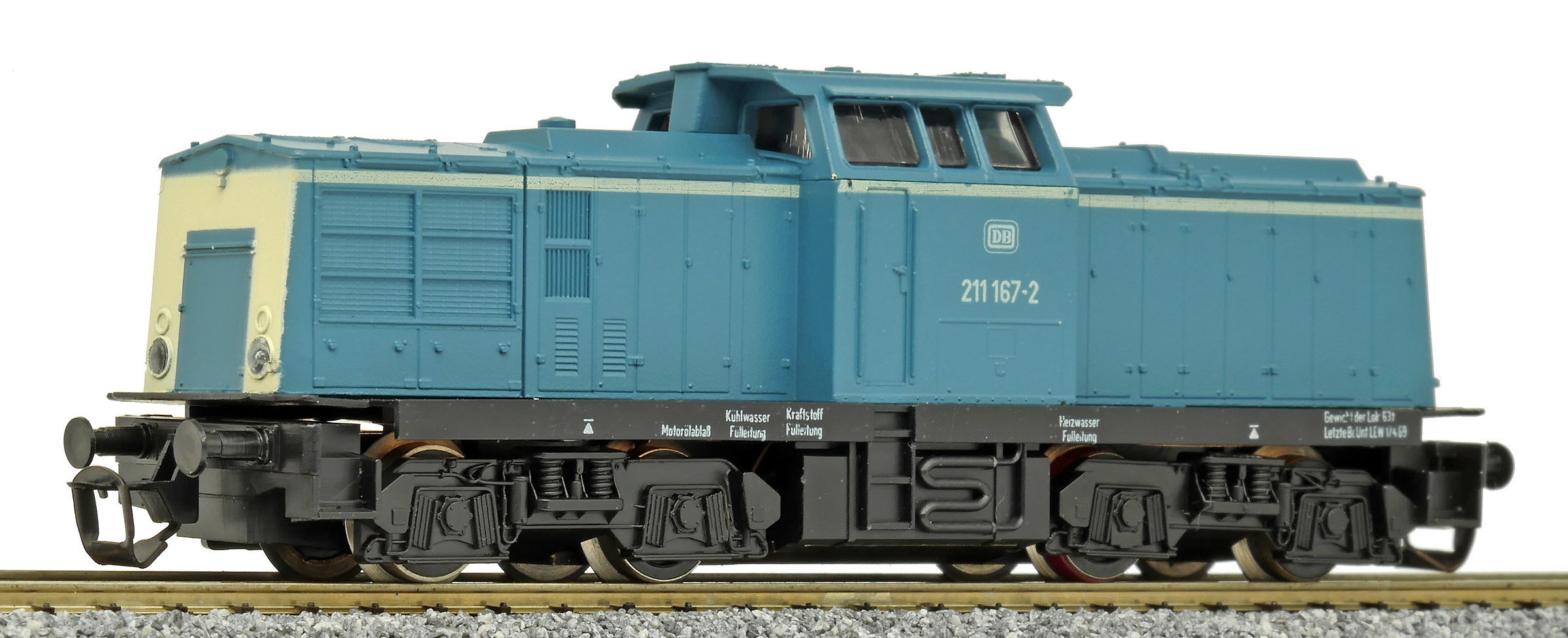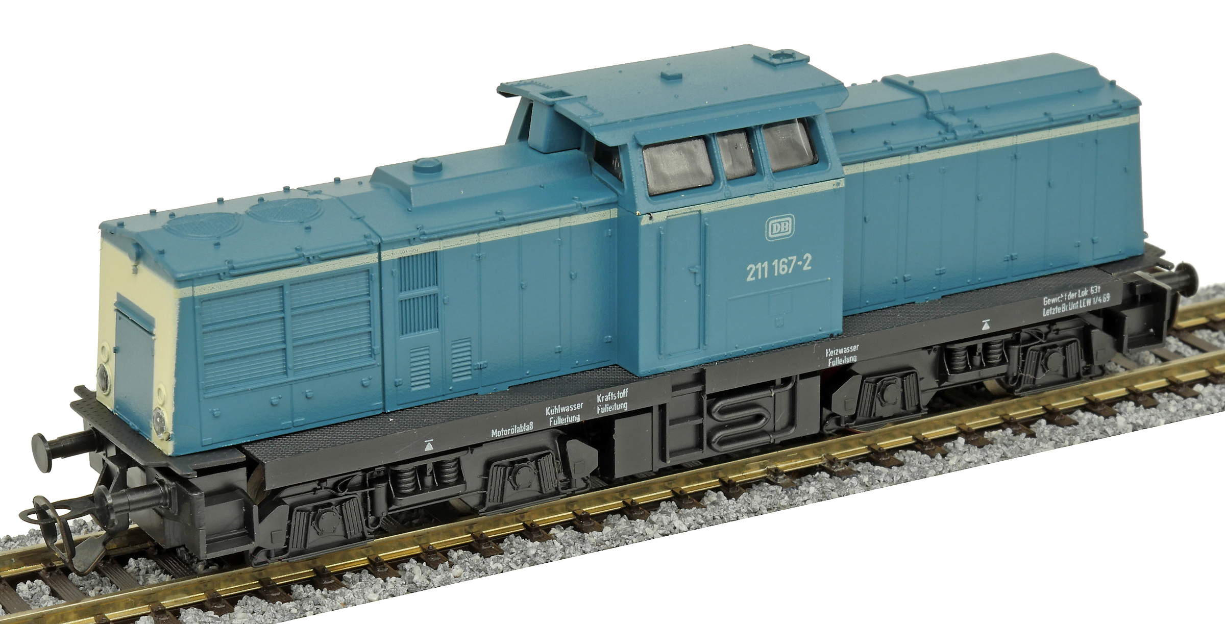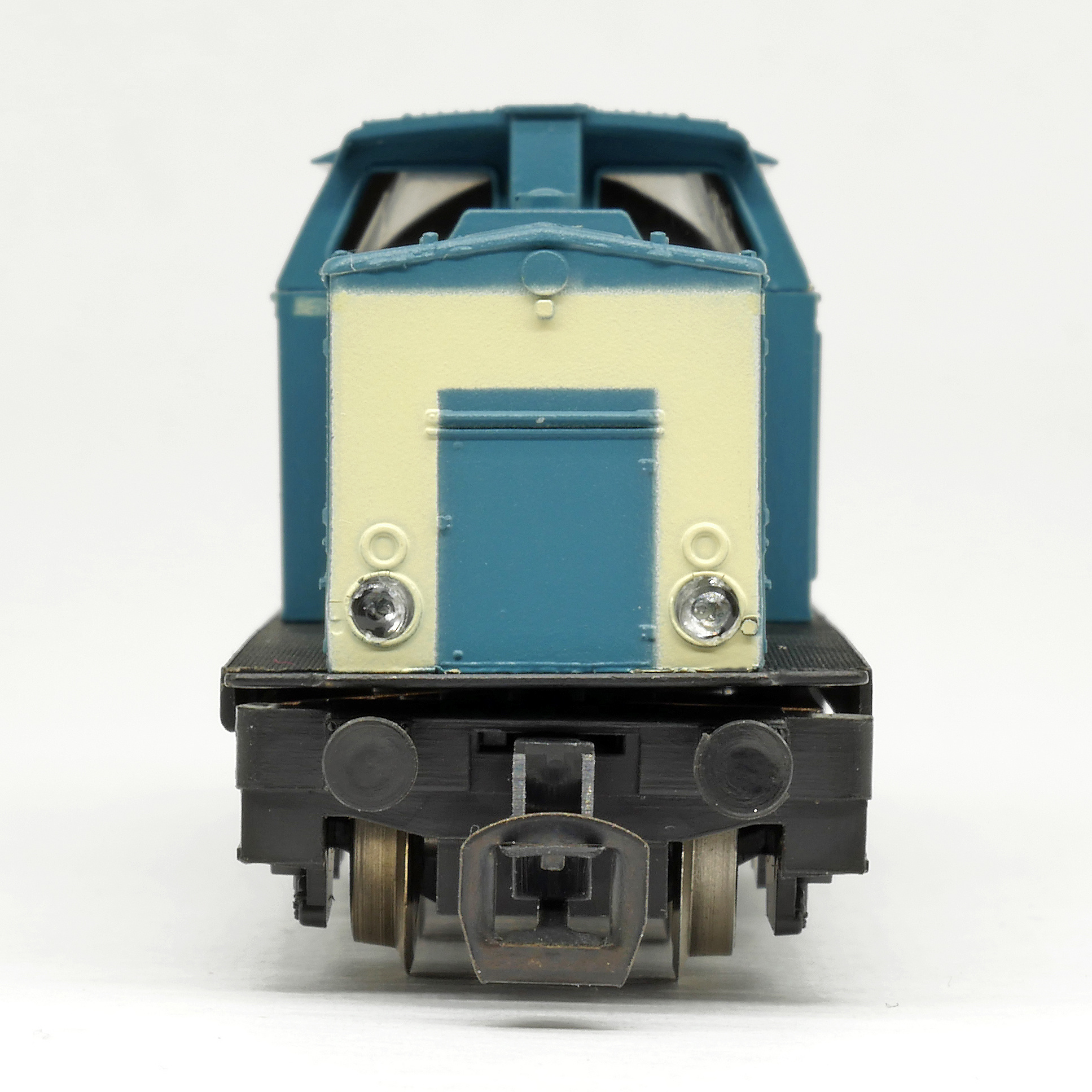 | dieselová lokomotiva modrá s bílým čelem, černý rám a pojezd |