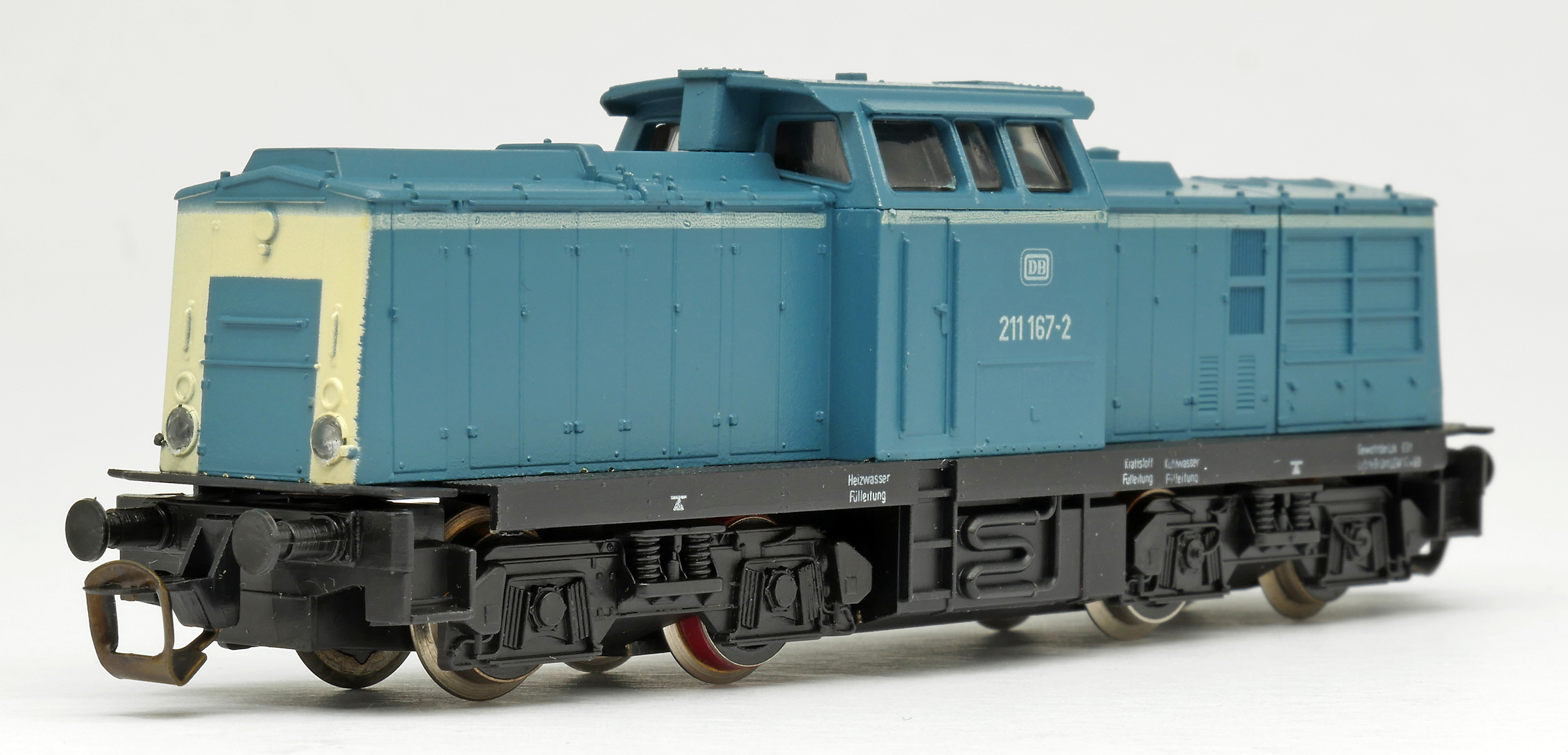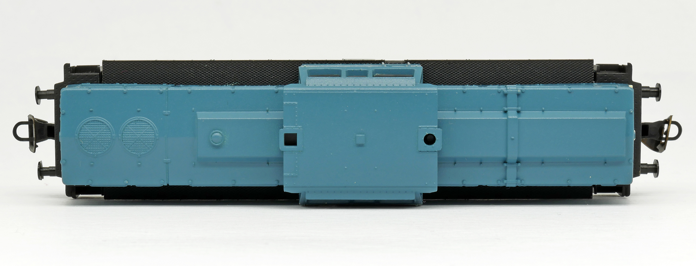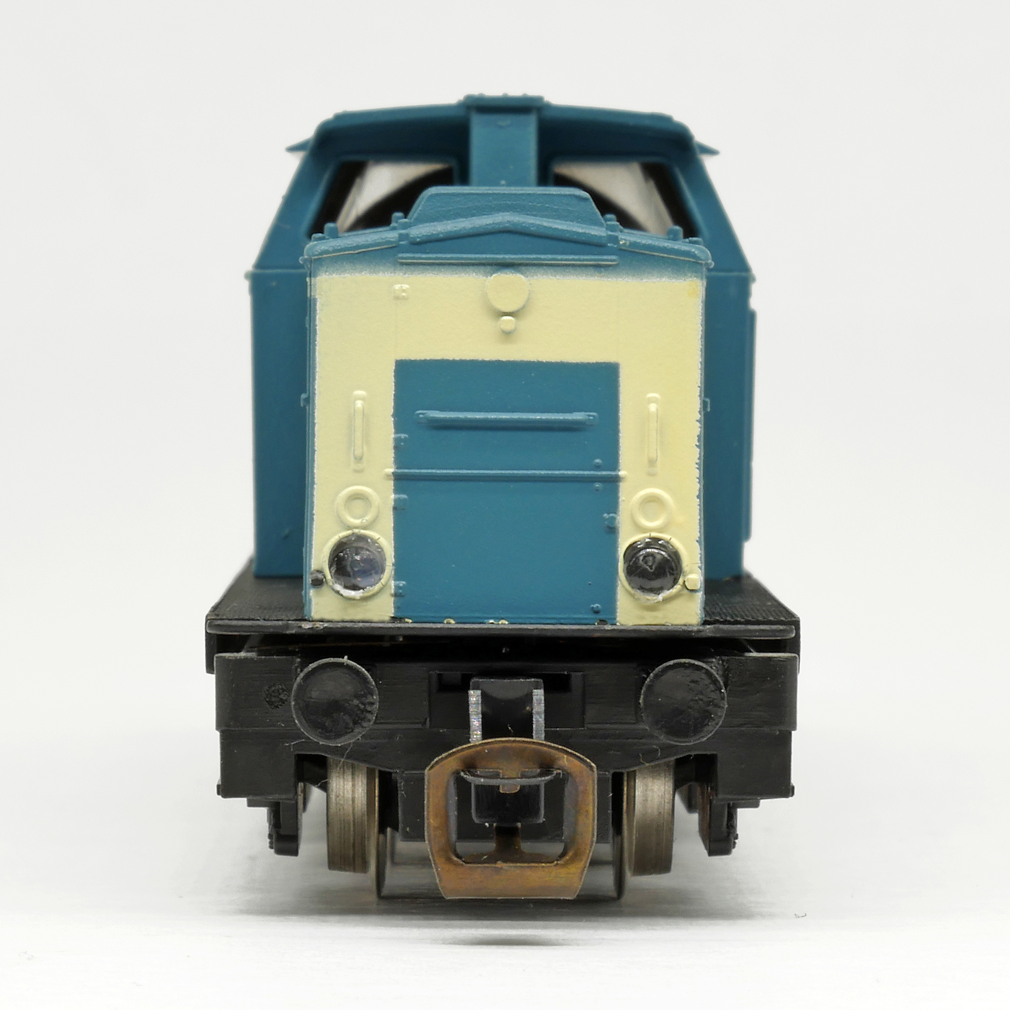 | dieselová lokomotiva modrá s bílým čelem, černý rám a pojezd |