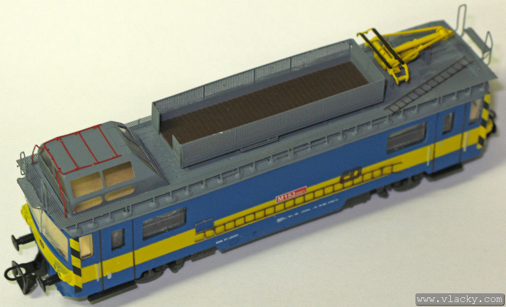 motorový vůz na opravu vrchního vedení modrý s výstražným žlutým pruhem