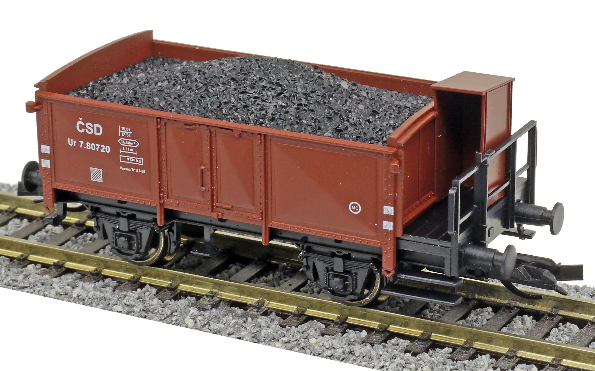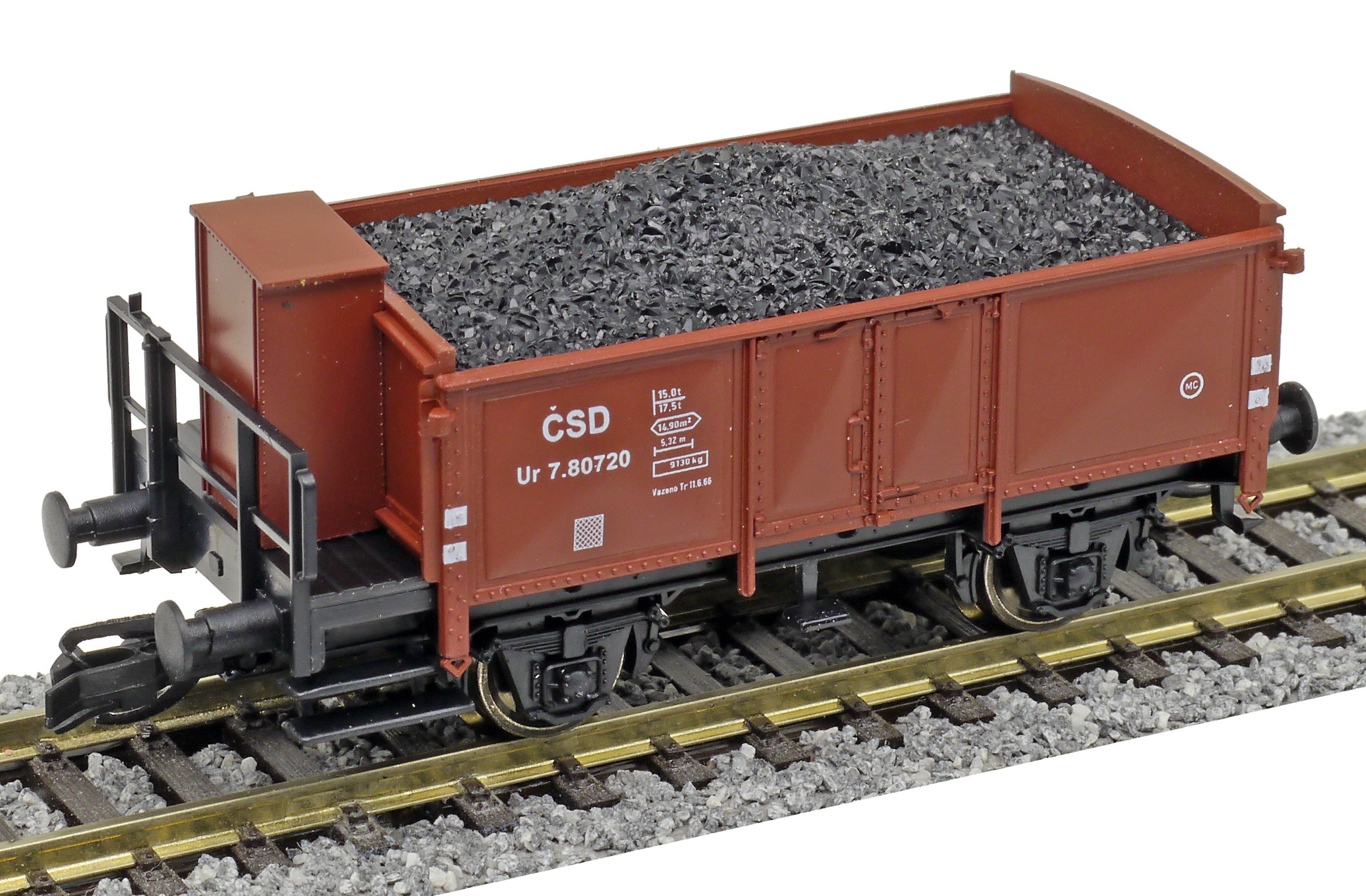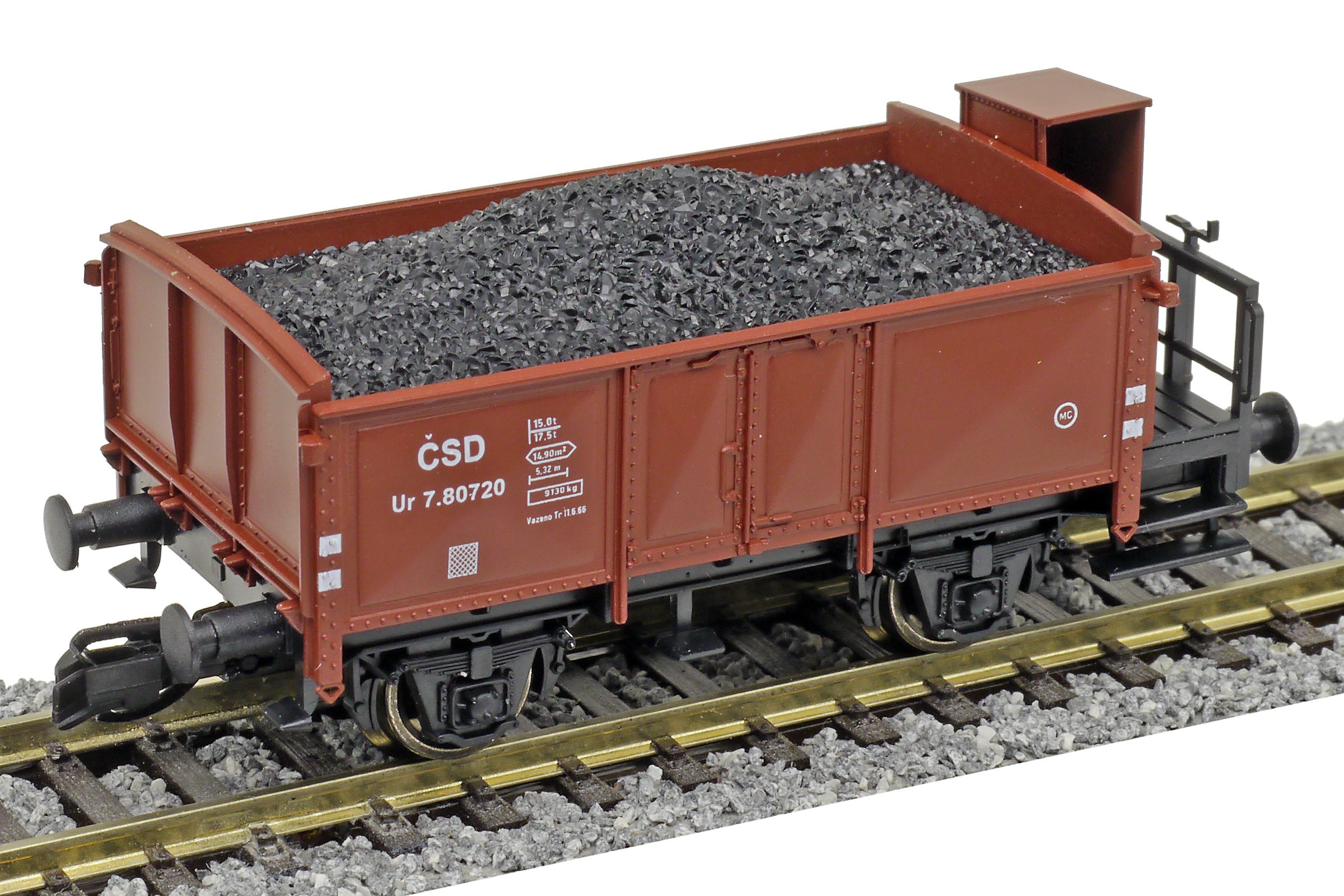 | otevřený nákladní vůz červenohnědý s brzdařskou budkou ložený uhlím |