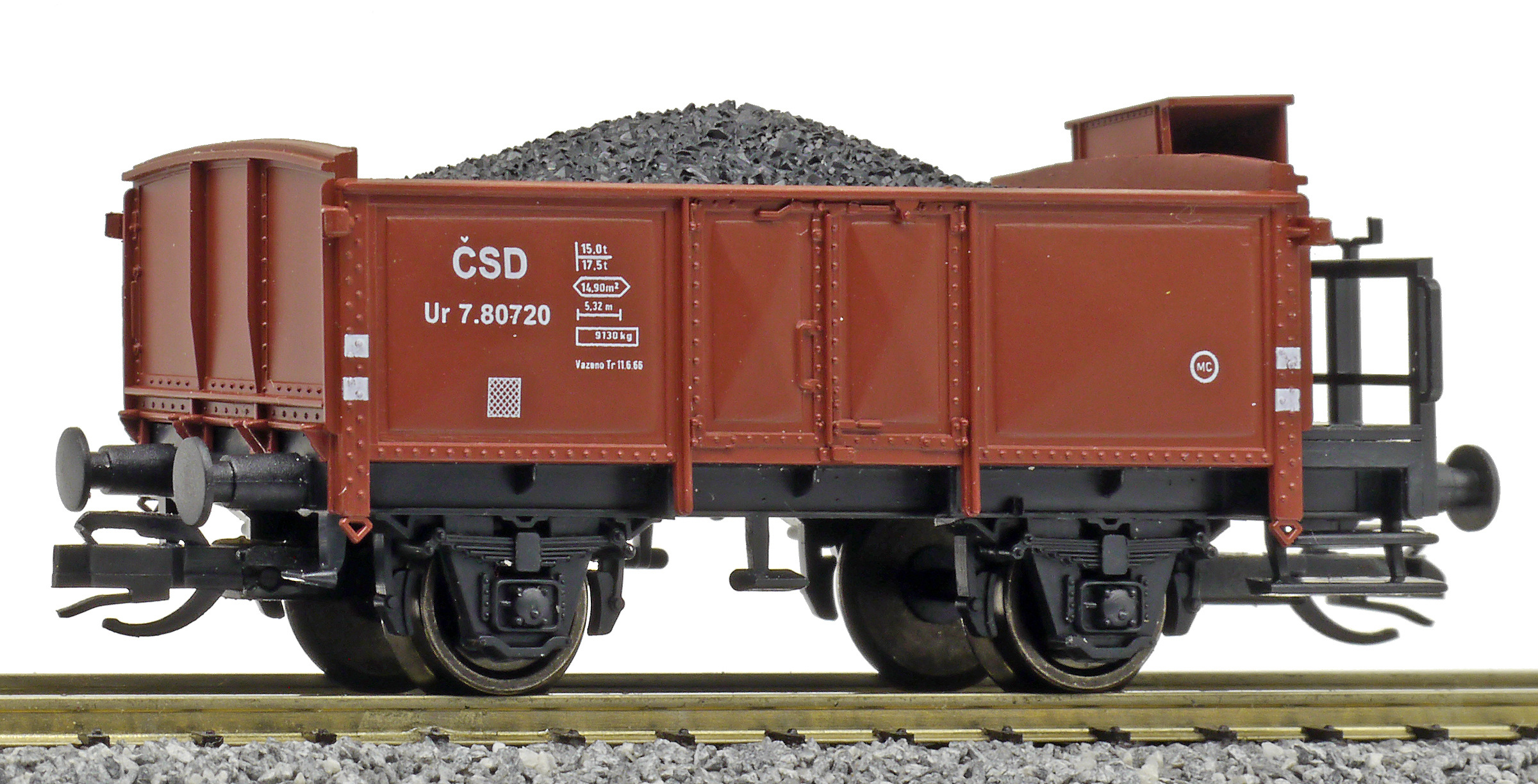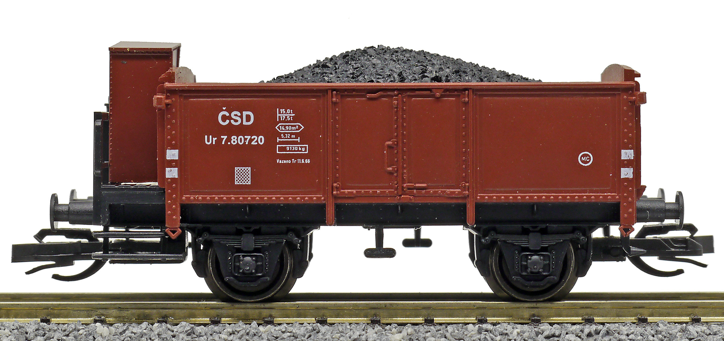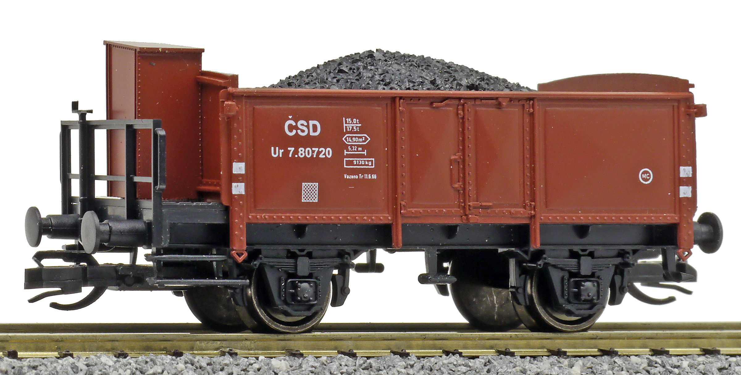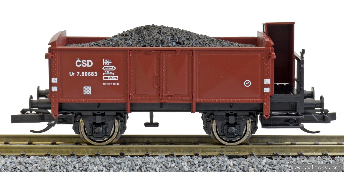 | otevřený nákladní vůz červenohnědý s brzdařskou budkou ložený uhlím |