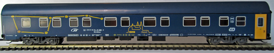 | tmavě modrý se siluetou „Třebíč“, lůžkový |