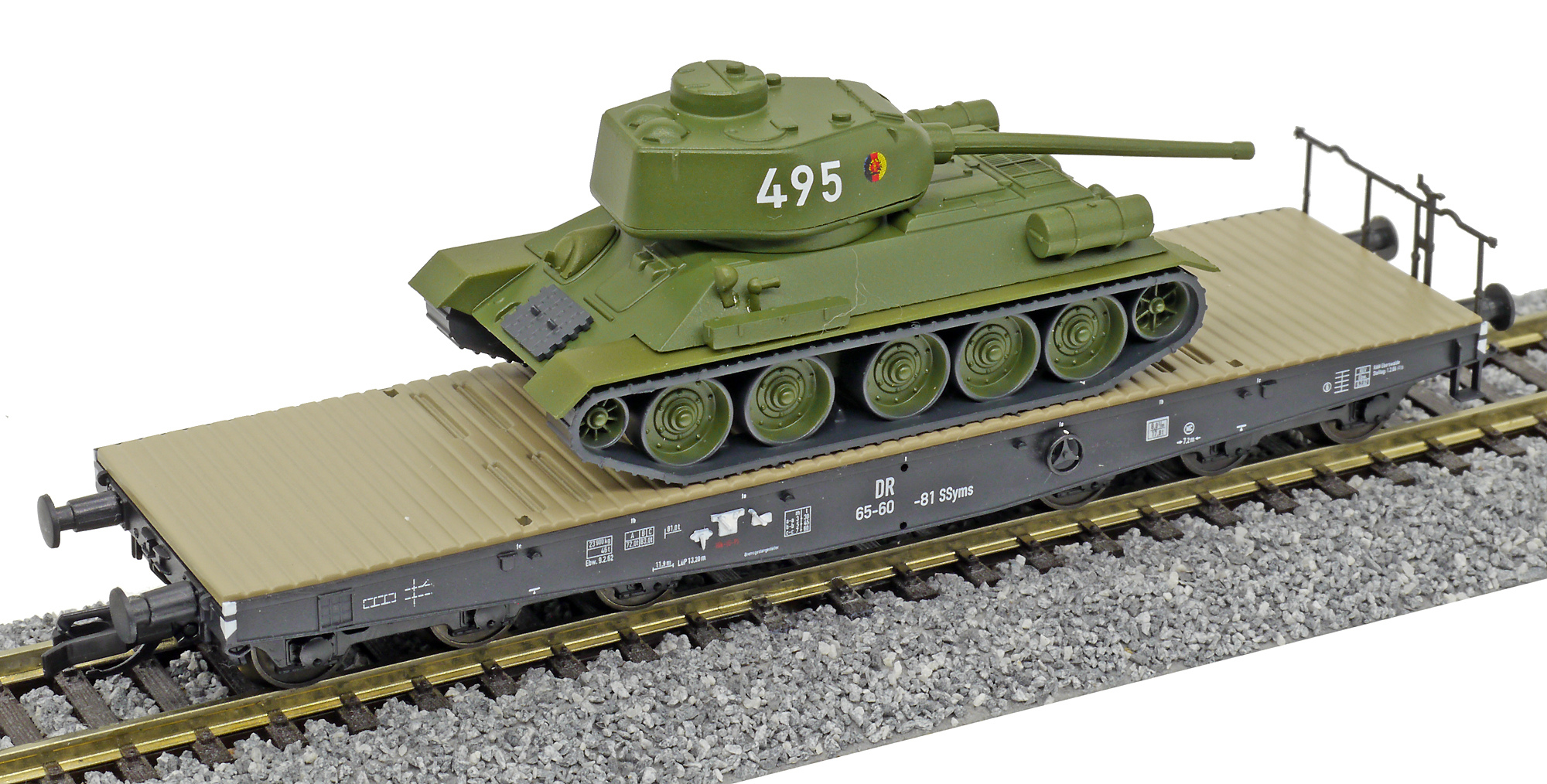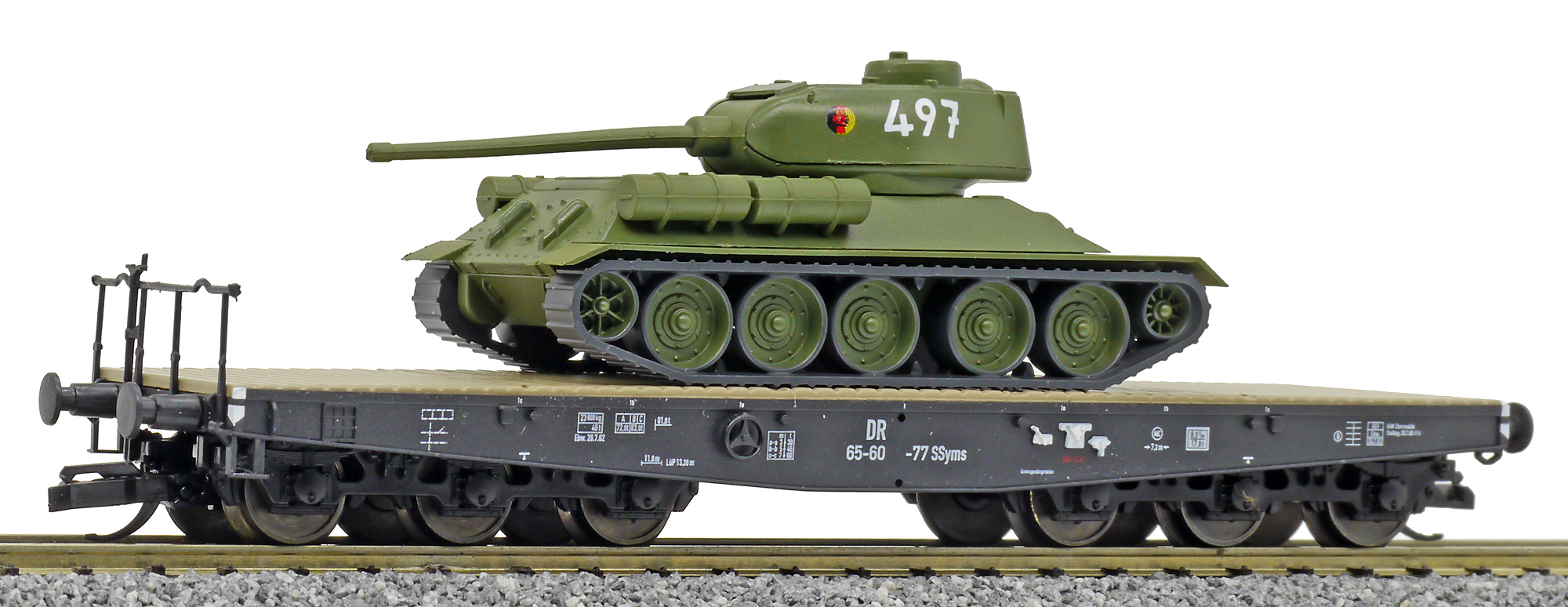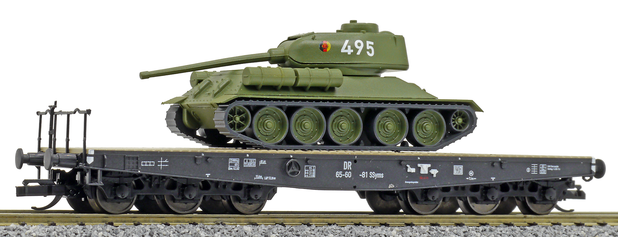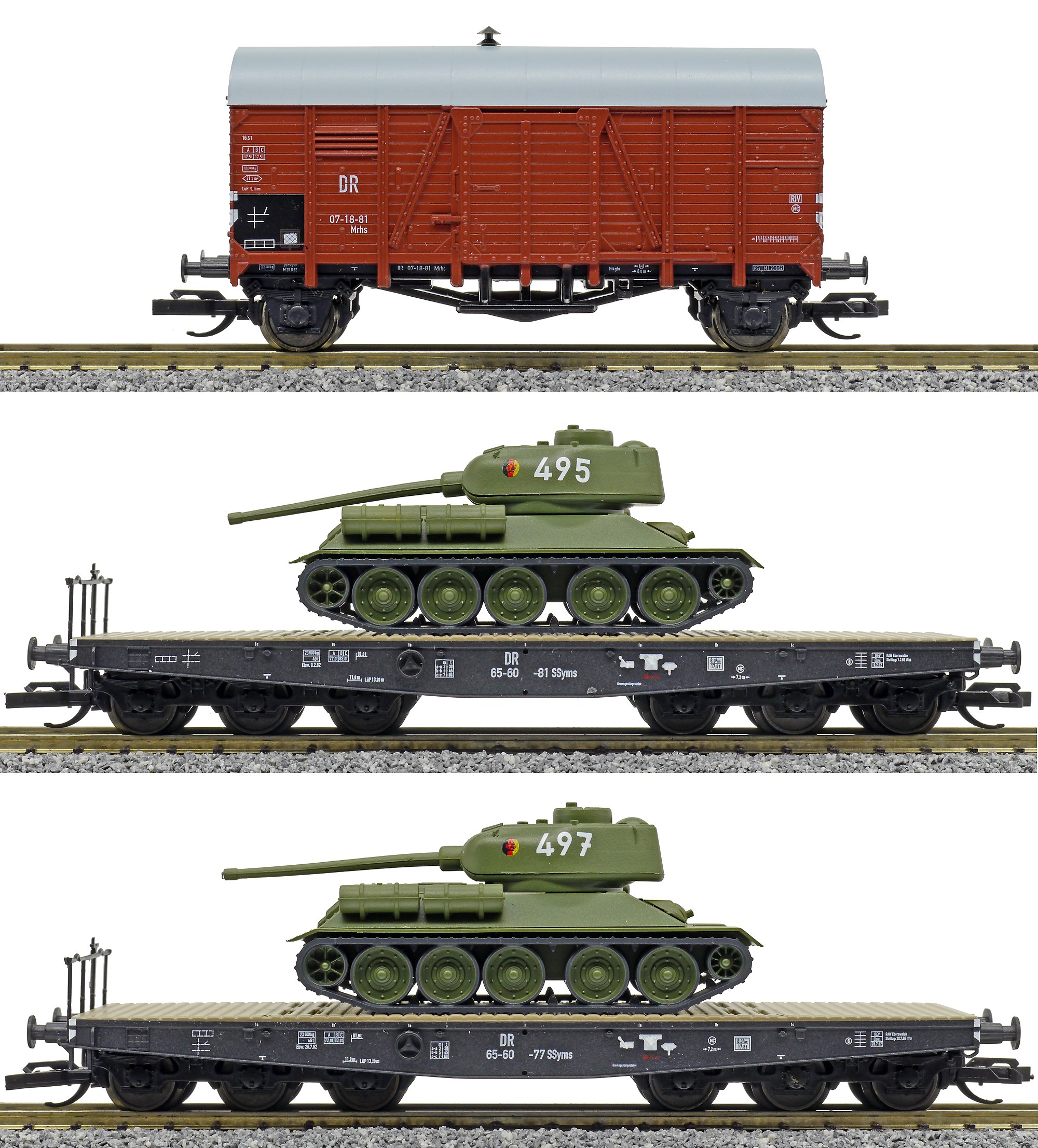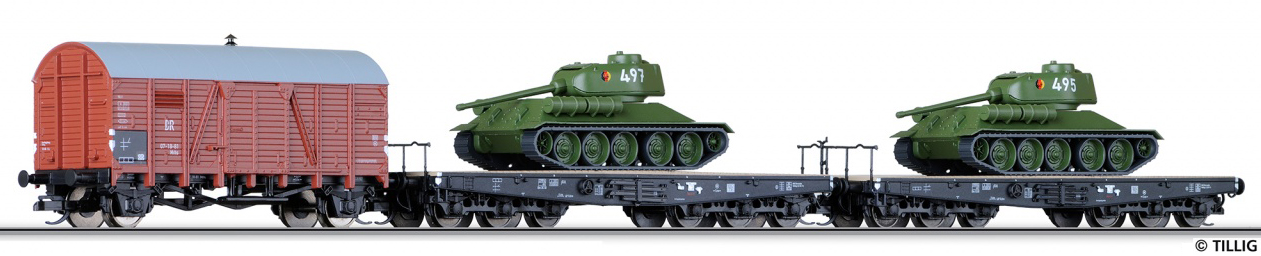 Popis   set krytého vozu a dvou plošinových vozů s tanky T34/85