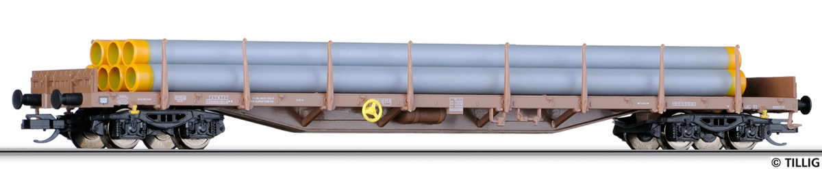 | nákladní plošinový vůz hnědý s nákladem rour |