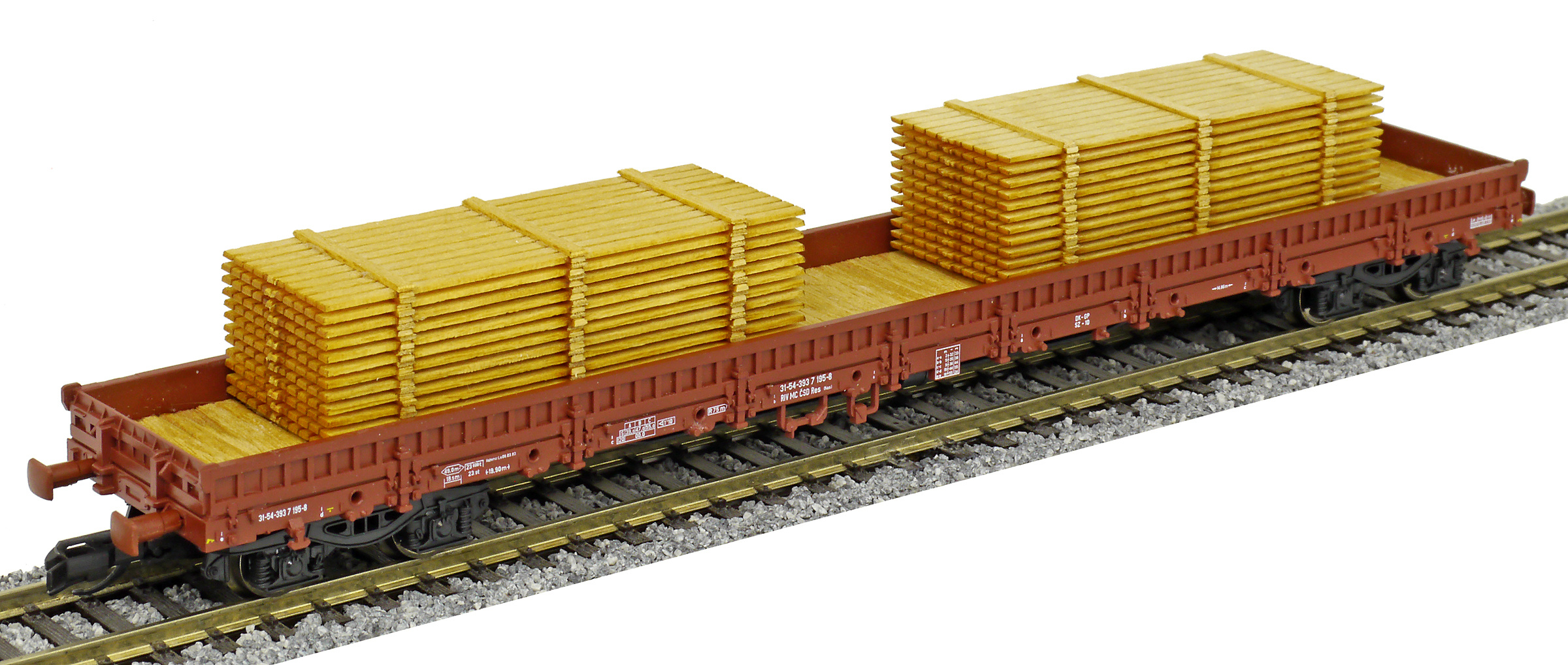 | nízkostěnný nákladní vůz červenohnědý s nákladem dvou balíků prken |