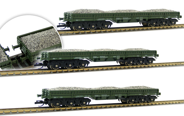 | set tří zelených vozů do pracovního vlaku ložených stěrkem |