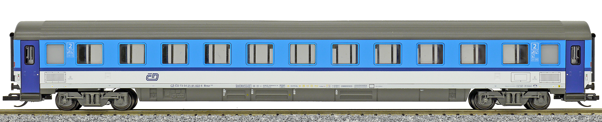 rychlíkový vůz v barevném schematu „Najbrt“ 2. tř.