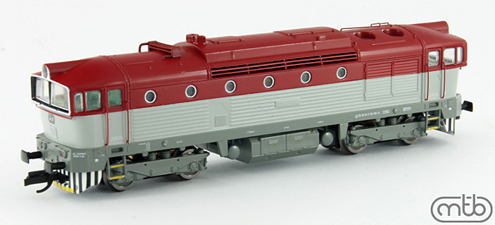 Popis   dieselová lokomotiva červená-bílá se světlešedým pojezdem