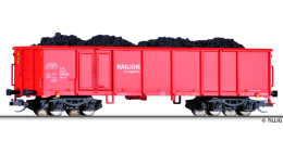 | vysokostěnný nákladní vůz červený „Railion” s nákladem uhlí |