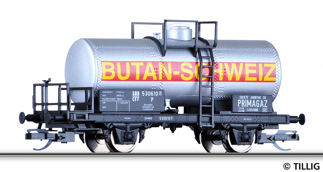 stříbrná s červeným pásem a žlutým nápisem „BUTAN-SCHWEIZ“