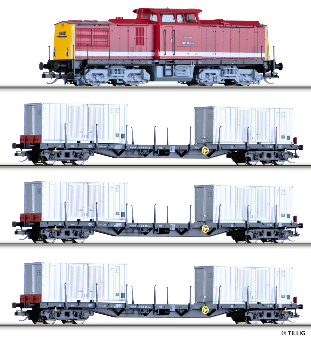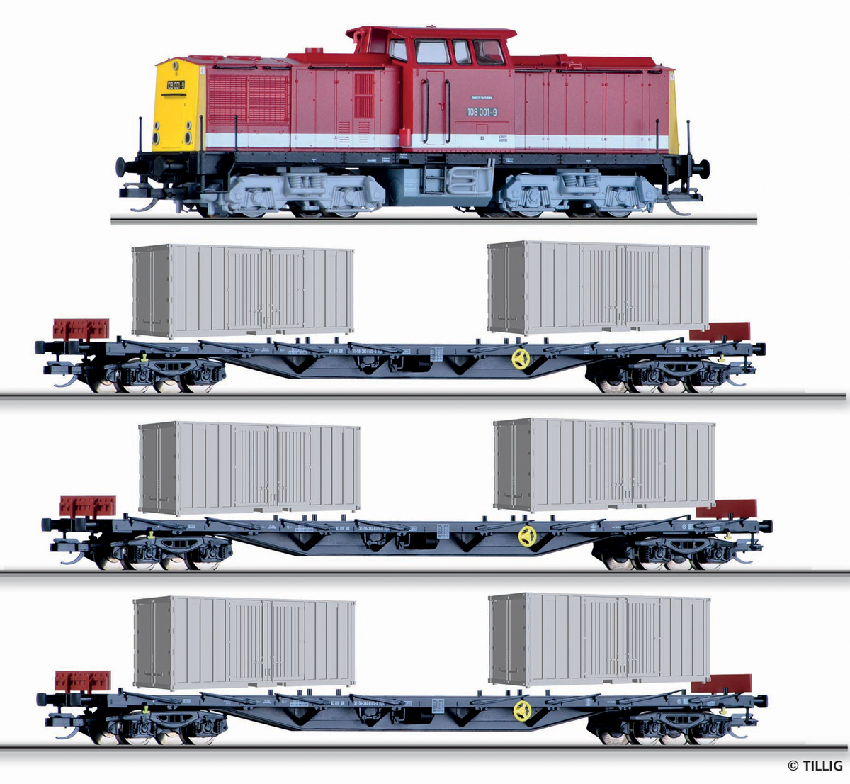 | set lokomotivy BR 108 a tří plošinových vozů s kontejnery 20', s kolejivem a ovladačem |