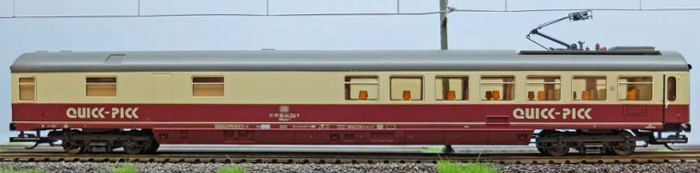 | červený-slonová kost, šedá střecha s pantografem, jídelní vůz „QuickPick“ |