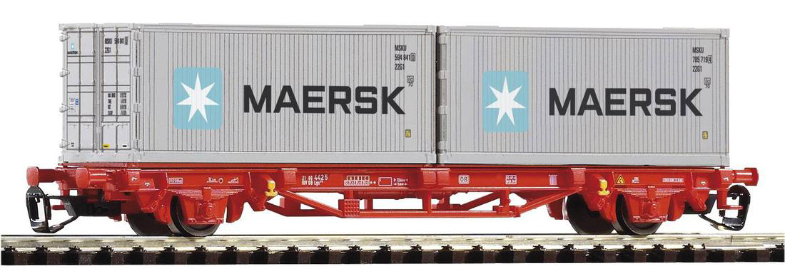 | plošinový vůz červený se dvěma kontejnery 20' „Maersk“ |