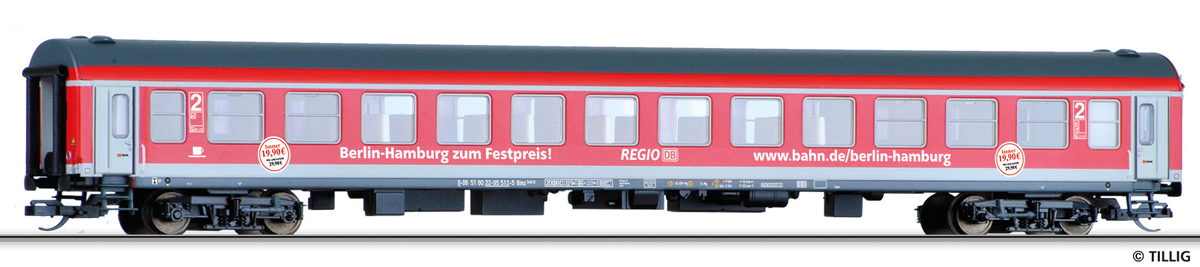 | rychlíkový vůz červený s café oddílem 2. tř. s reklamou „Berlin-Hamburg zum Festpreis!“ |