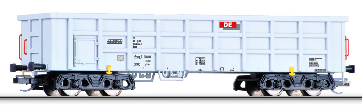 | vysokostěnný nákladní vůz světle šedý s červeným logem „Dortmunder Eisenbahn“ |