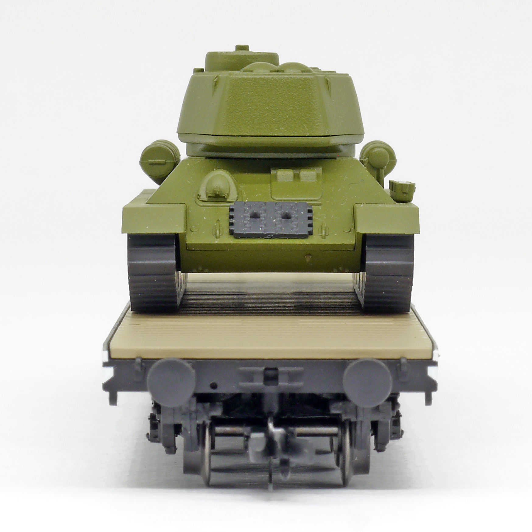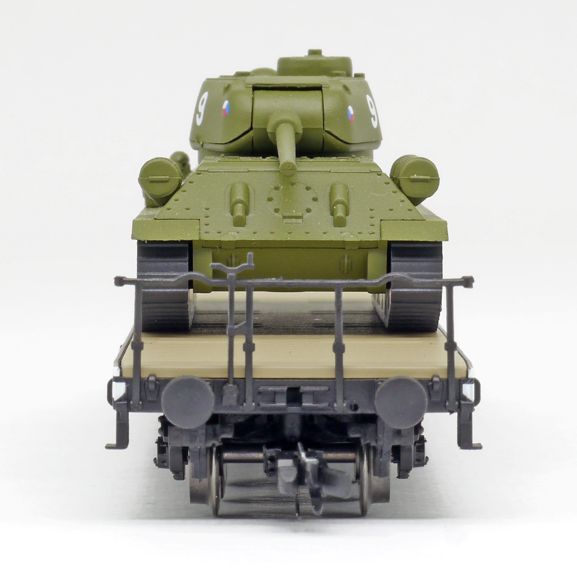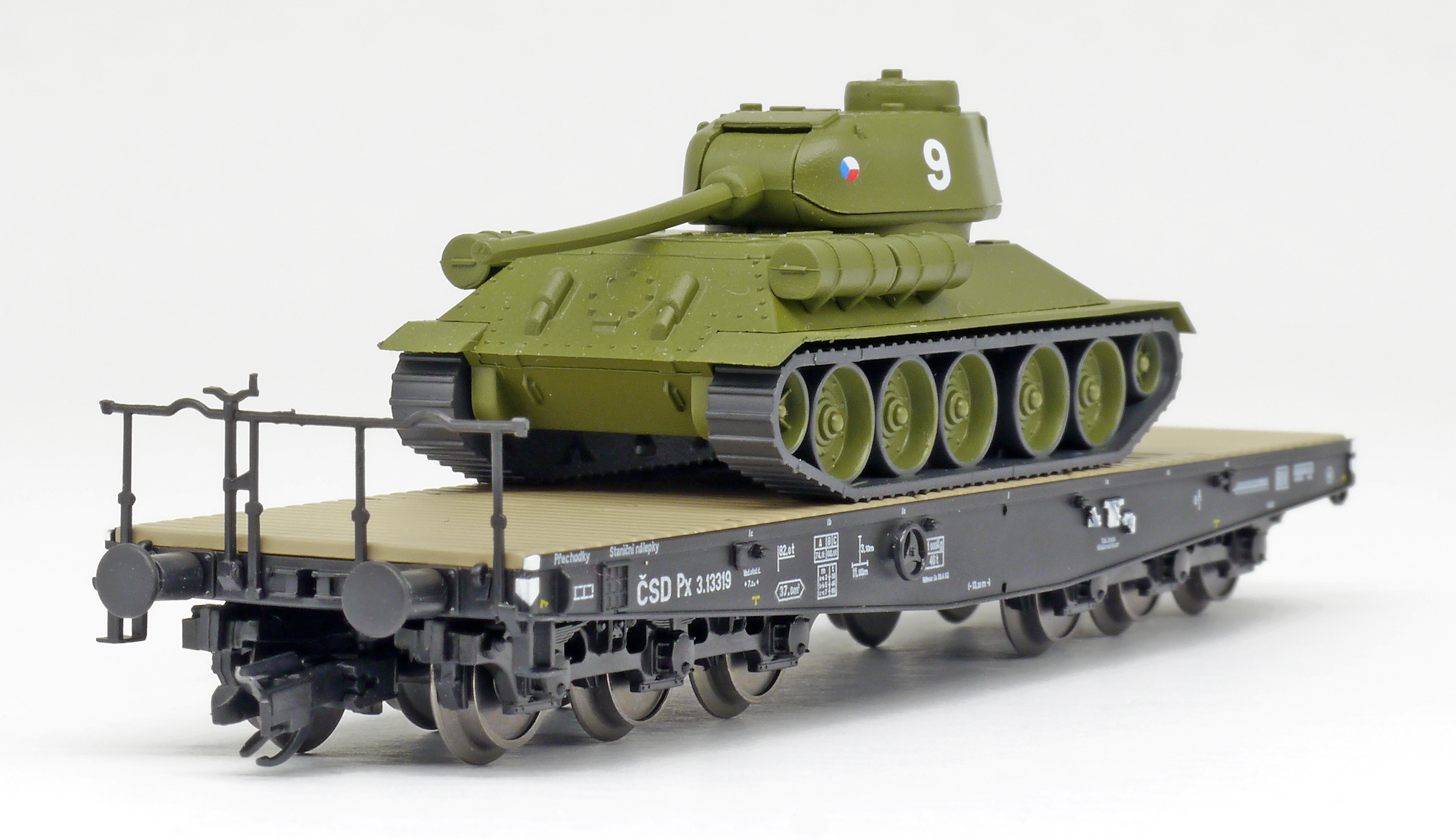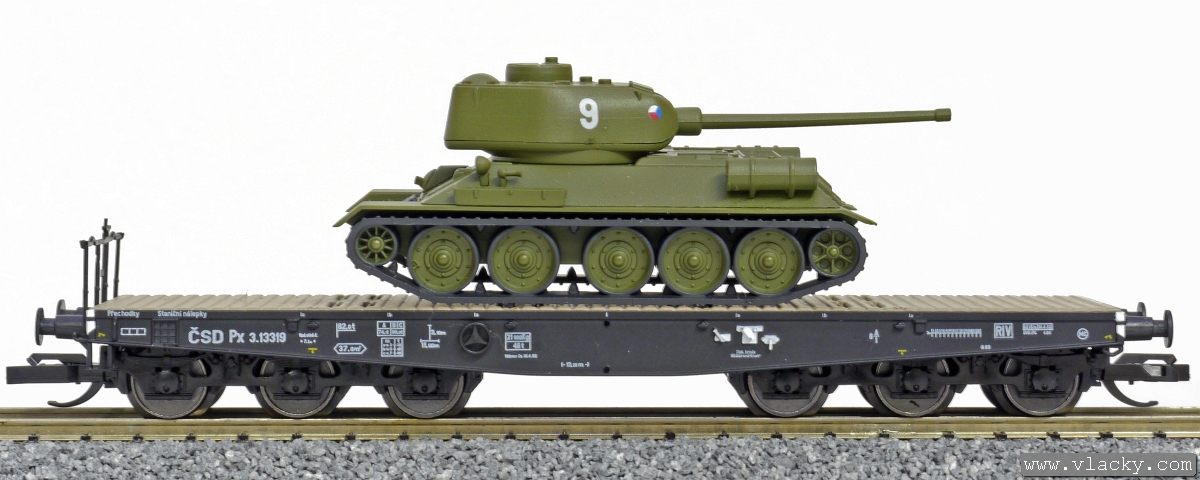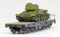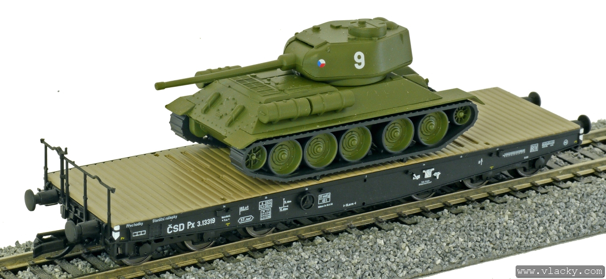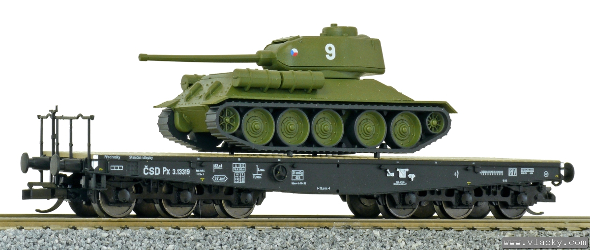 Popis   plošinový nákladní vůz černý s nákladem tanku T34/85