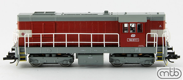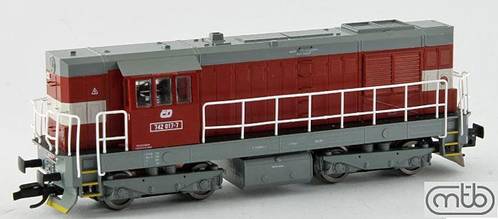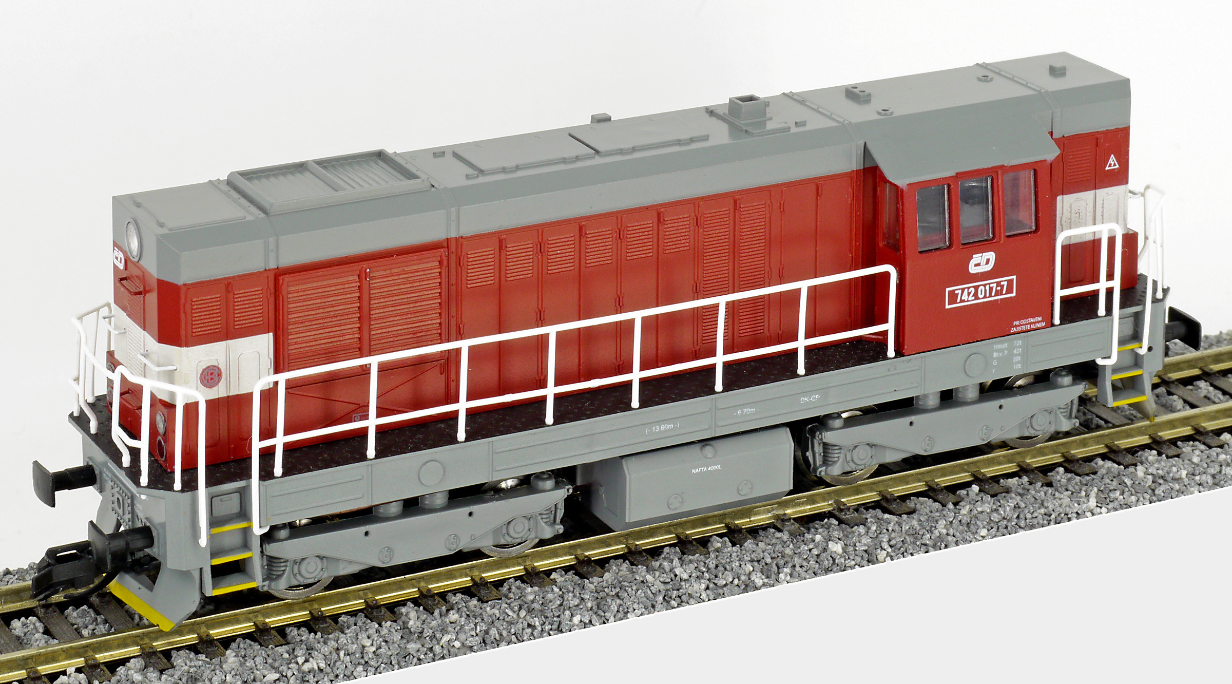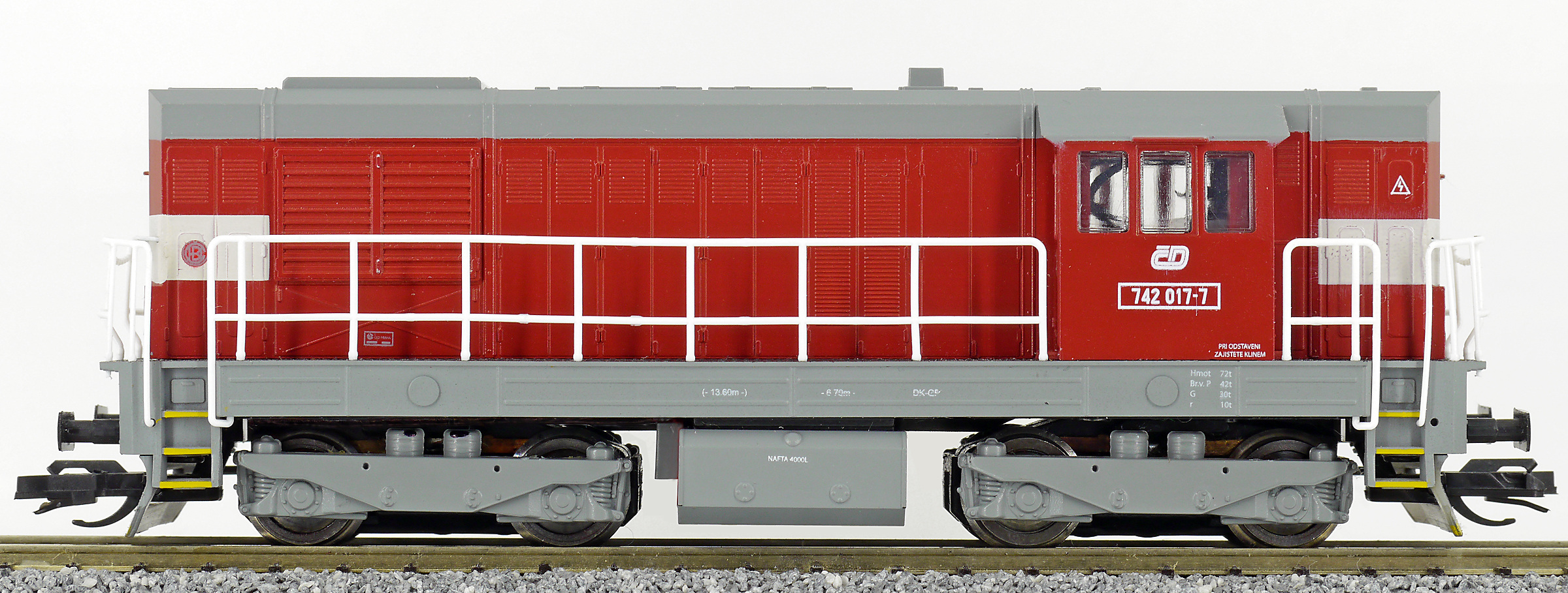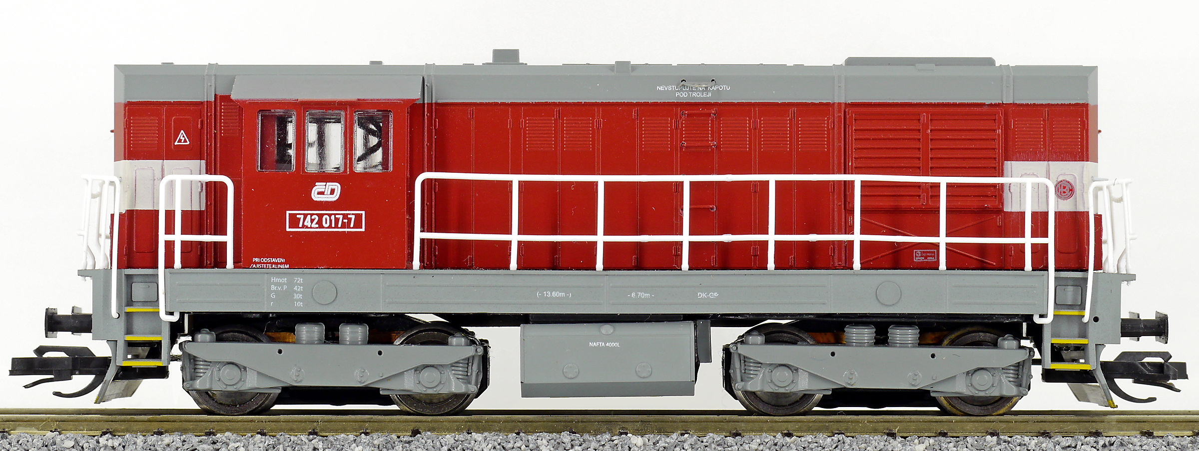 Popis   dieselová lokomotiva červená s šedou střechou, rámem a pojezdem a výstražným pruhem