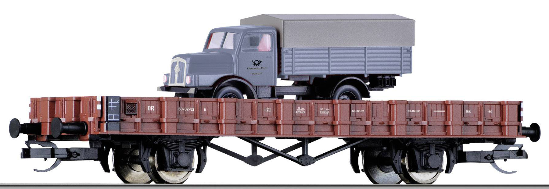 | nízkostěnný vůz červenohnědý s nákladem automobilu H3A „Deutsche Post“ |