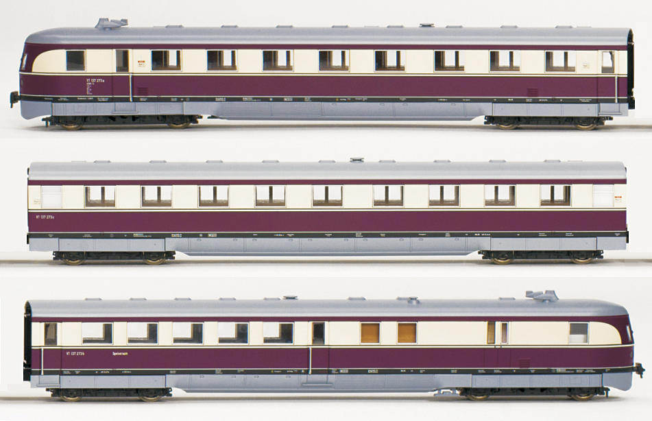 | fialovo-krémová s šedou střechou a pojezdem třídílná motorová jednotka typu „Köln“ |