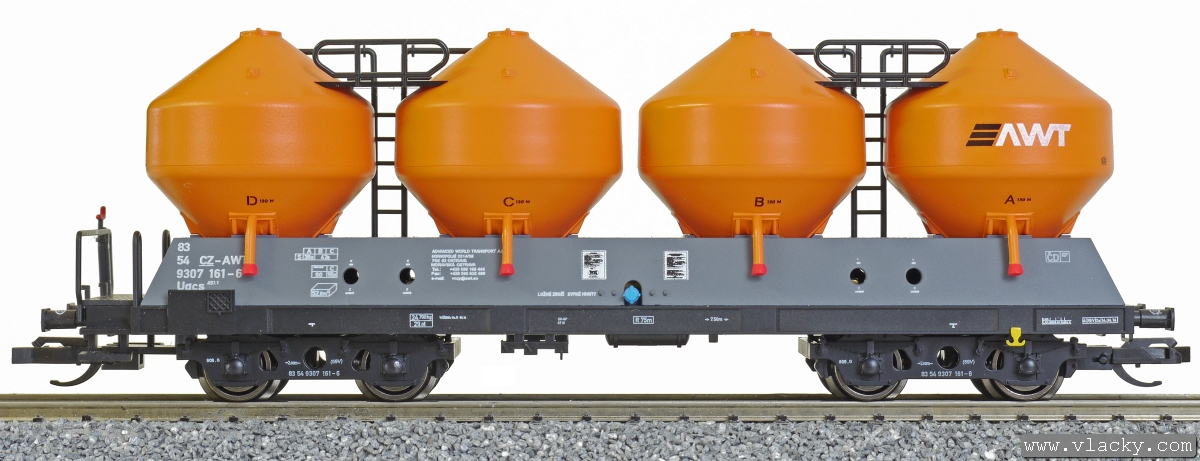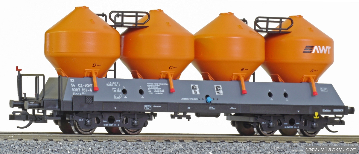 | nákladní samovýsypný vůz šedý s oranžovými nádobami s logem „AWT“ |