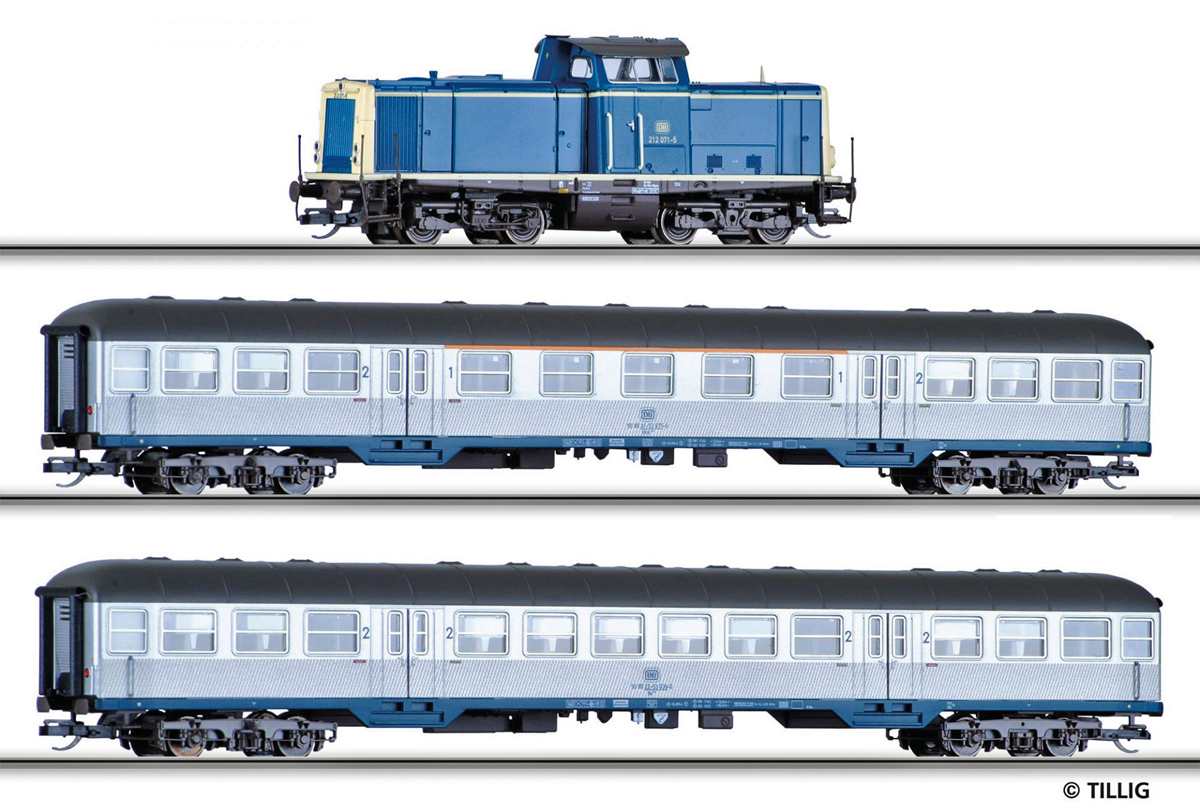 | set dieselové lokomotivy BR 212 a dvou osobních vozů |