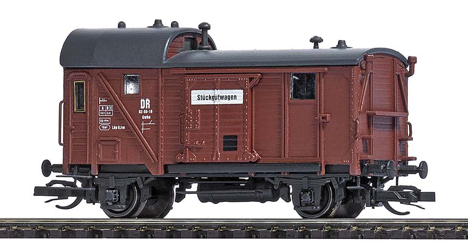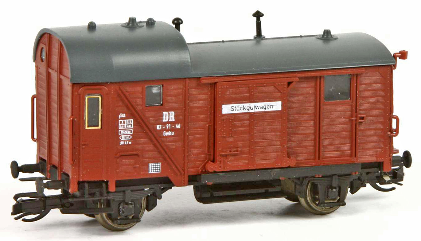 | zavazadlový vůz červenohnědý s černou střechou pro přepravu kusových zásilek |