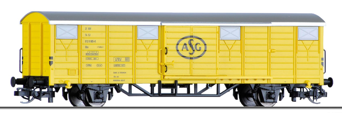 | krytý nákladní vůz žlutý se stříbrnou střechou „ASG“ |