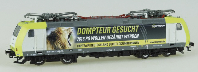 | elektrická lokomotiva s potiskem „Dompteur gesucht“ |