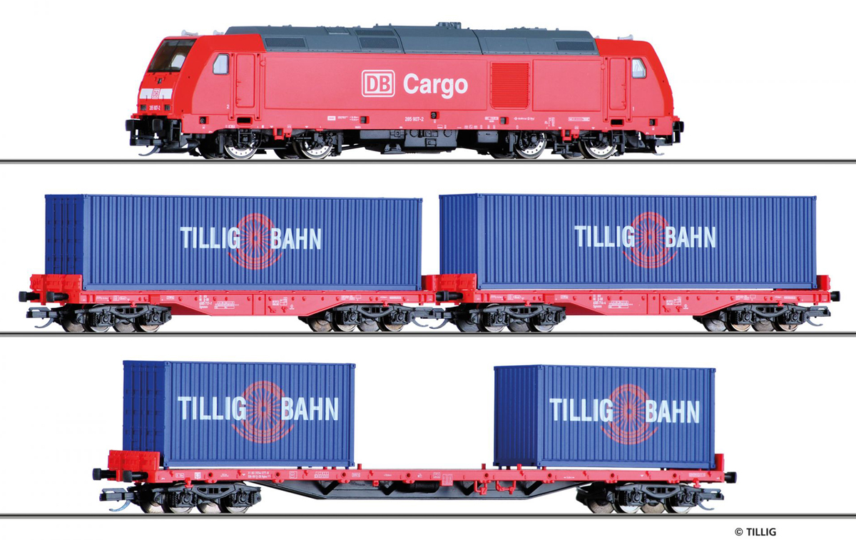 | set dieselové lokomotivy a tří nákladních vozů s nákladem kontejnerů |