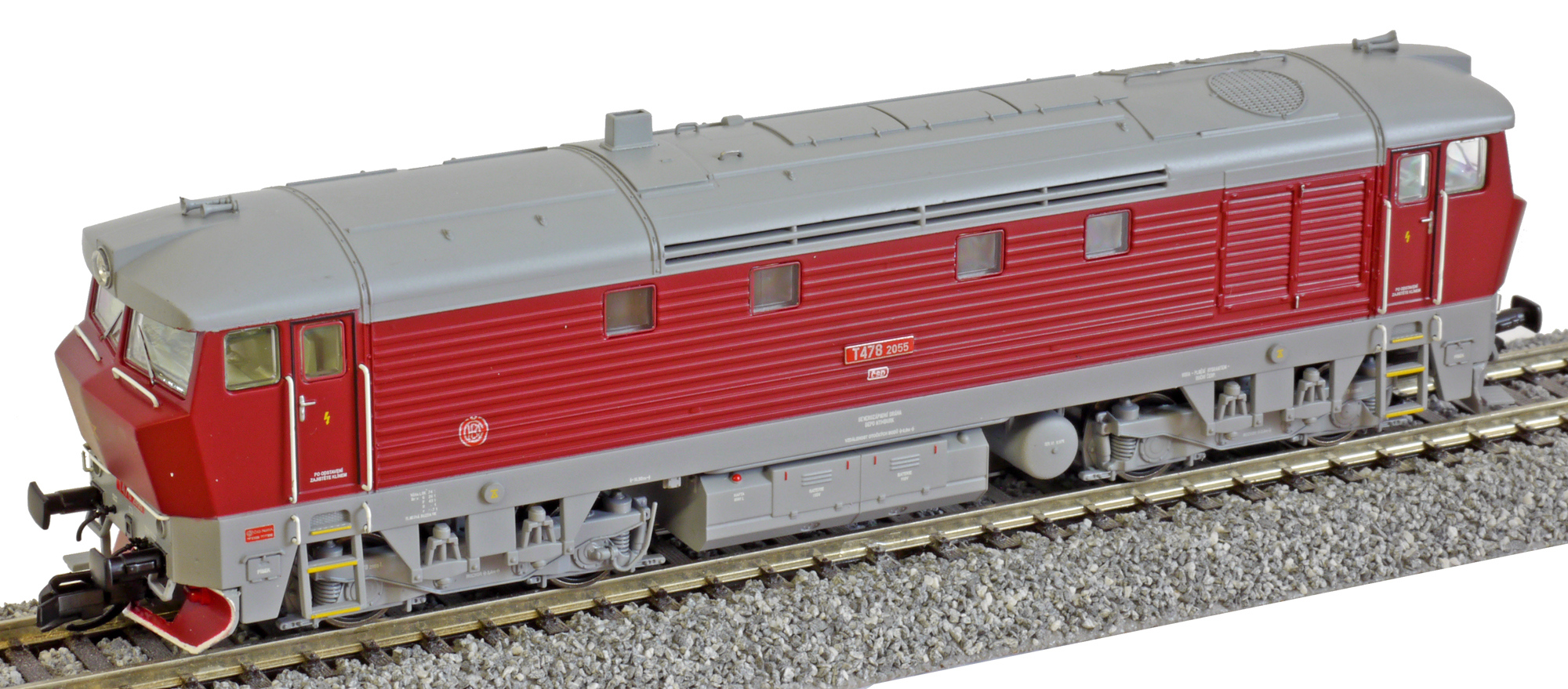 | dieselová lokomotiva červená, šedá střecha a pojezd |