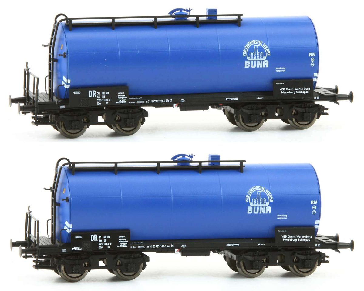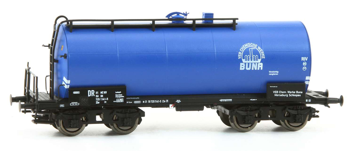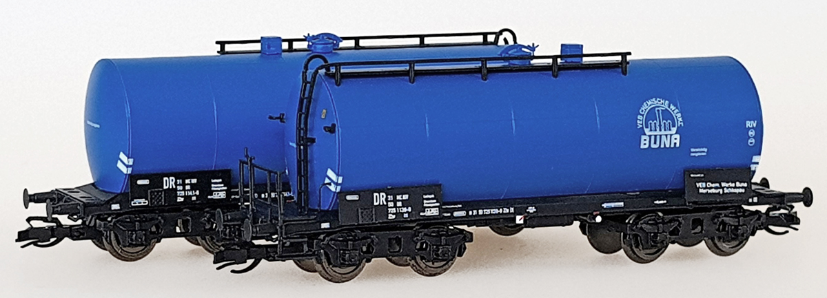 Popis   kotlový vůz modrý s podélnou lávkou „Buna“