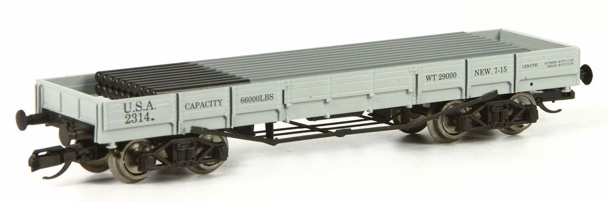 | nízkostěnný nákladní vůz šedý s nákladem telegrafních sloupů |