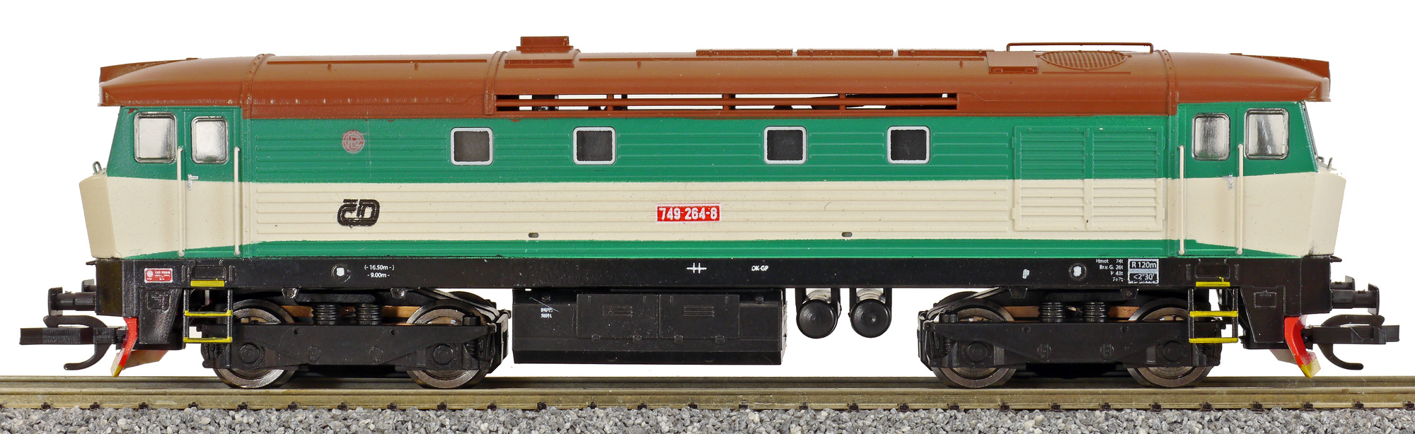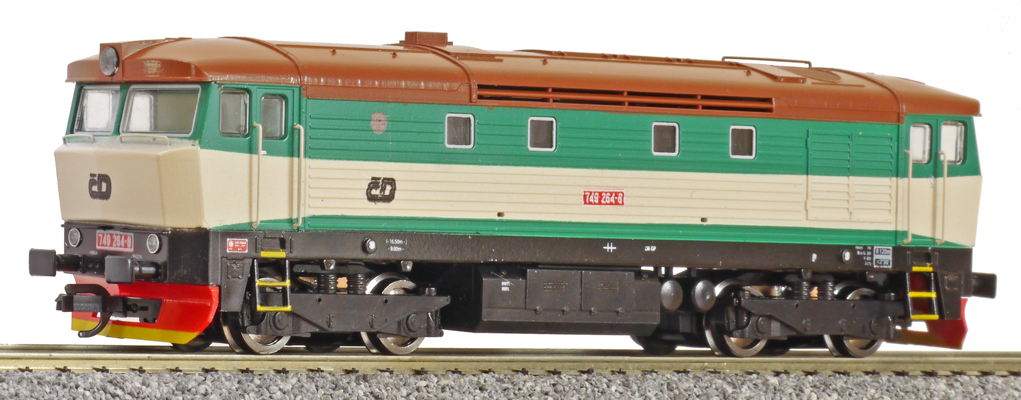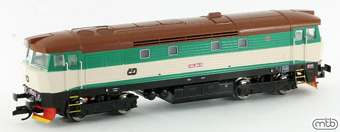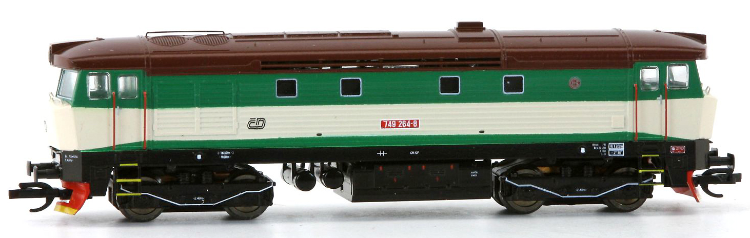 Popis   dieselová lokomotiva zelená-slonová kost, hnědá střecha, černý rám a pojezd