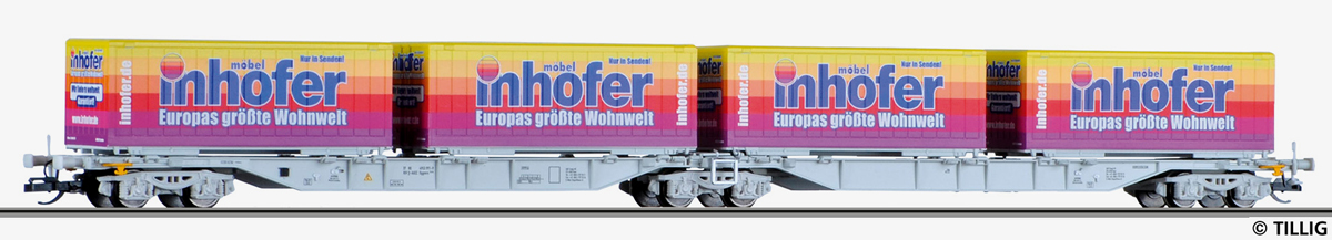 | dvoudílný kontejnerový vůz šedý „Kombiwaggon“ s nákladem čtyř kontejnerů 20' „Inhofer“ |
