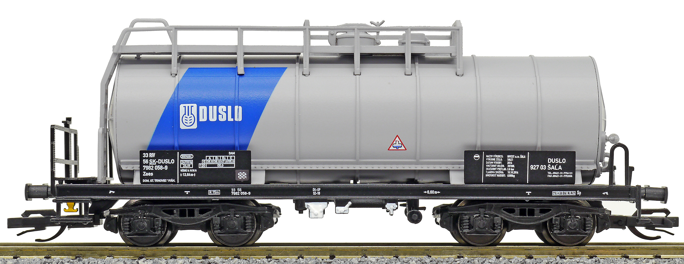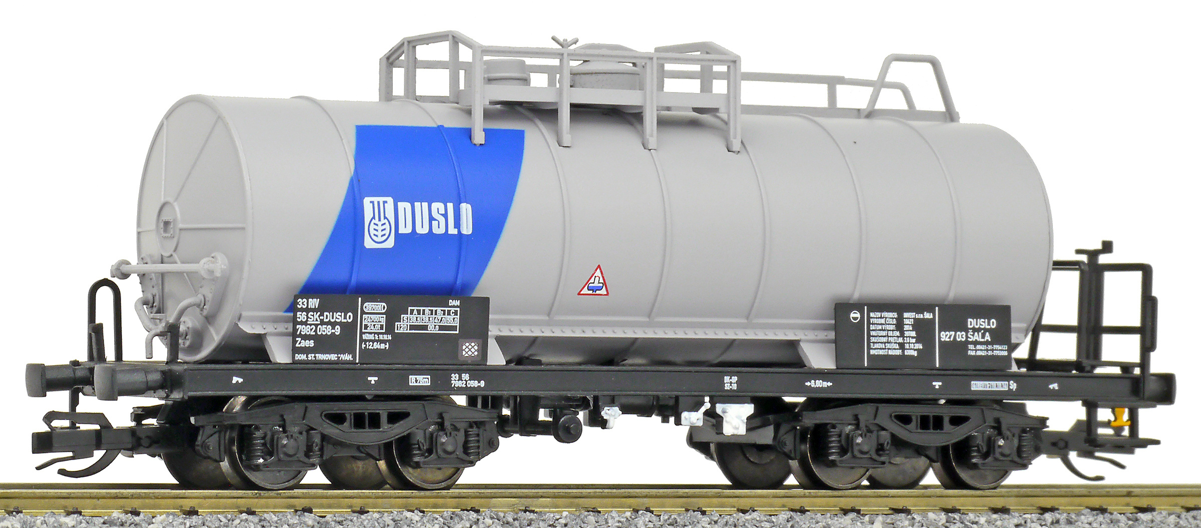 | kotlový vůz šedý s modrým pásem a s logem „DUSLO“ |