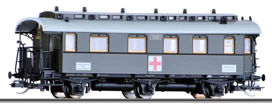 | osobní vůz zelený s šedou střechou z lazaretního vlaku „Vereins-Lazarettzug“ |