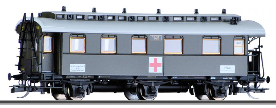 | osobní vůz zelený s šedou střechou z lazaretního vlaku „Vereins-Lazarettzug“ |