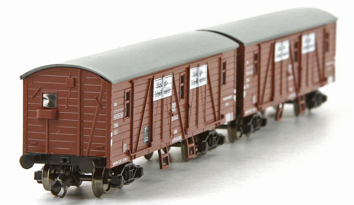 | dvojice krytých vozů Leig červenohnědých s šedou střechou |