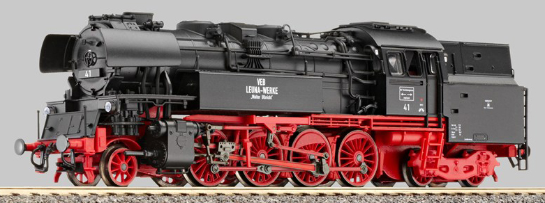 | parní lokomotiva černá s červeným pojezdem a s kouřovými plechy, VEB LEUNA-WERKE |