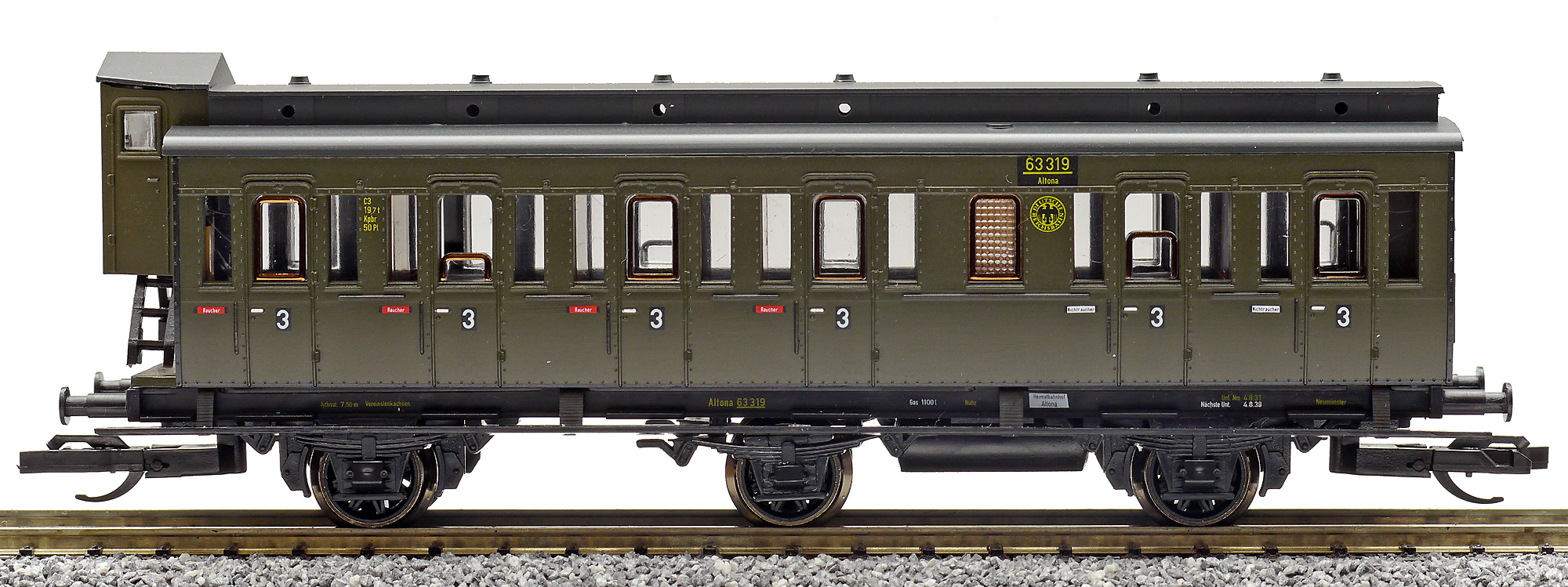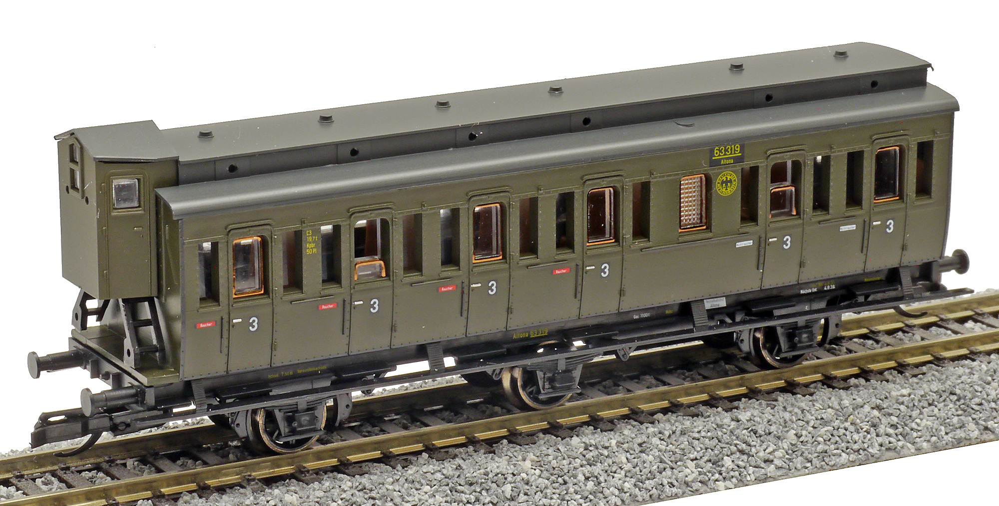 | oddílový osobní vůz tmavě zelený s černou střechou a s brzdařskou budkou 3. tř. |