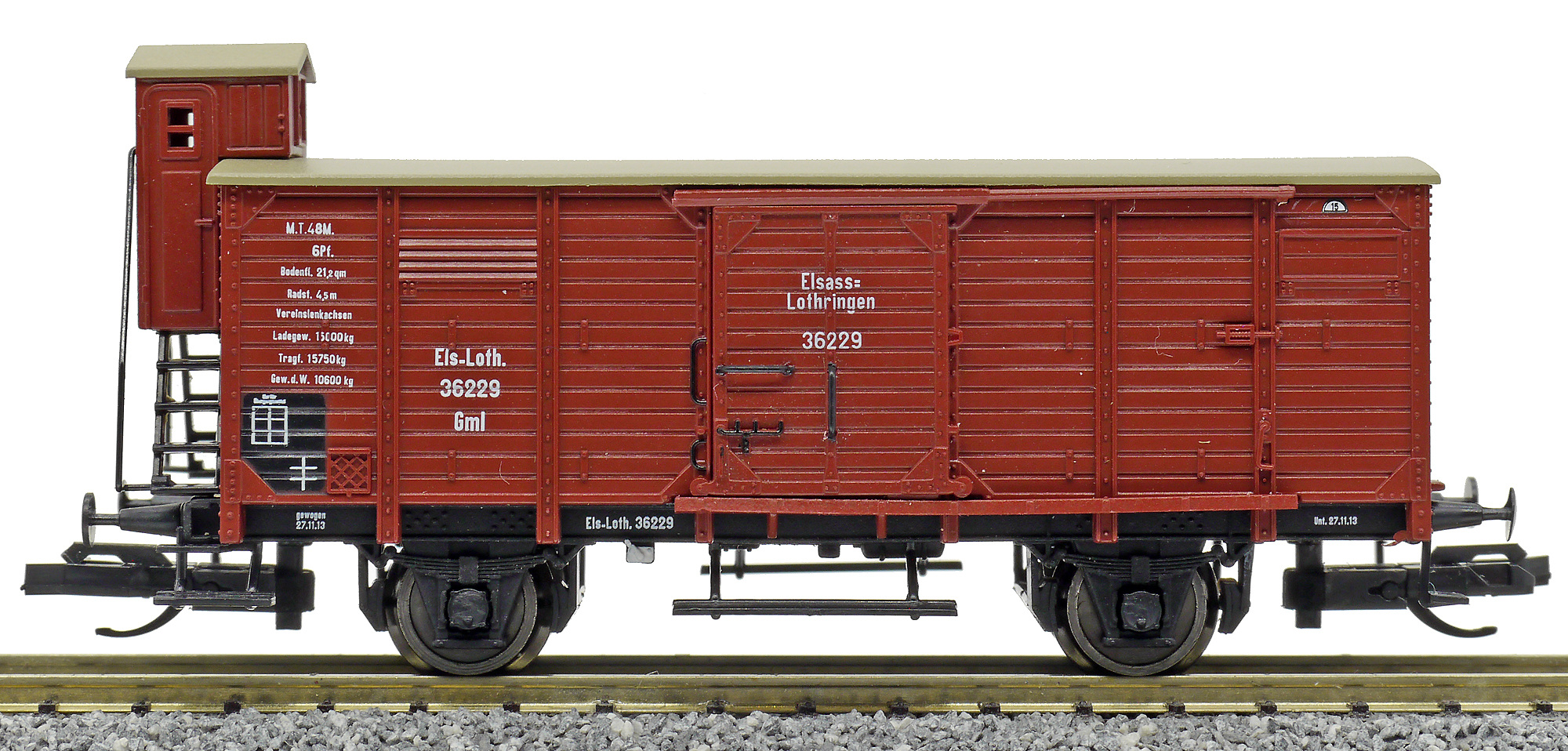 | krytý nákladní vůz červenohnědý s hnědou střechou a s brzdařskou budkou |